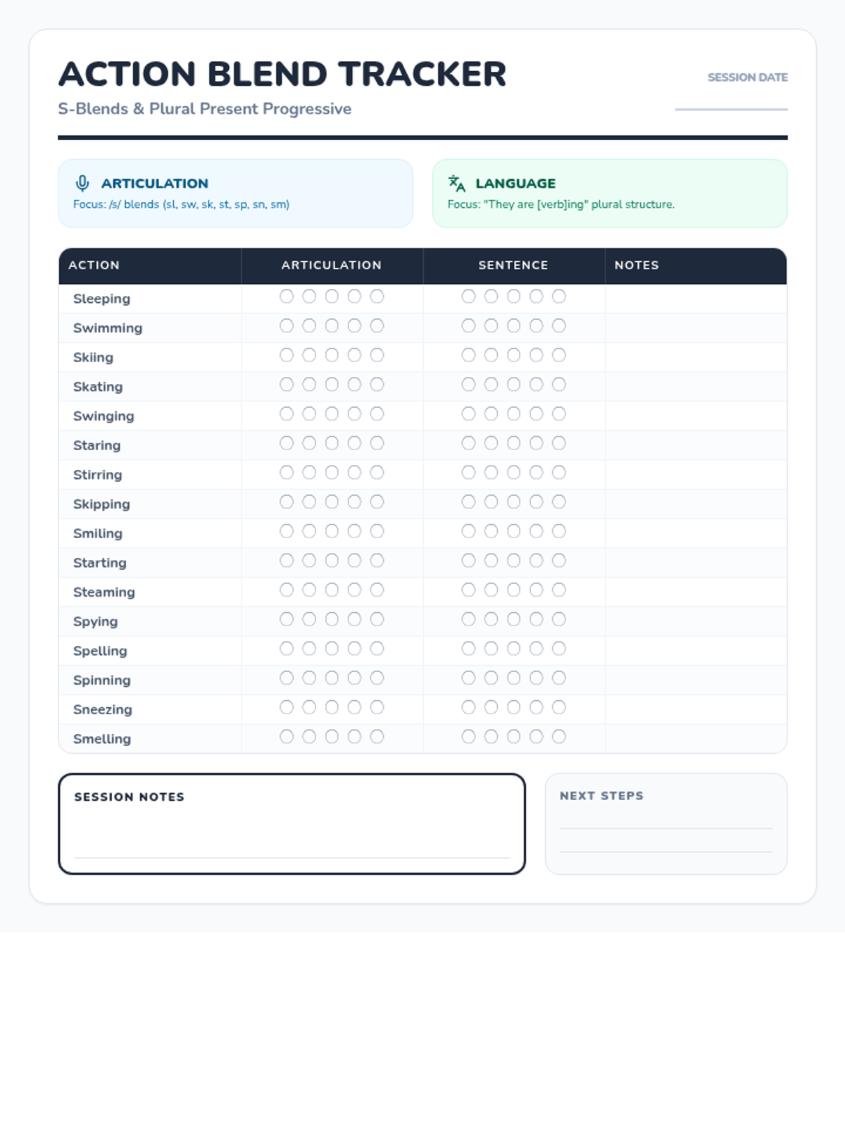 A teacher-facing tracking sheet for speech-language therapy sessions. Includes space to monitor articulation accuracy for s-blends and sentence structure mastery for plural present progressive frames. Optimized for single-page printing.