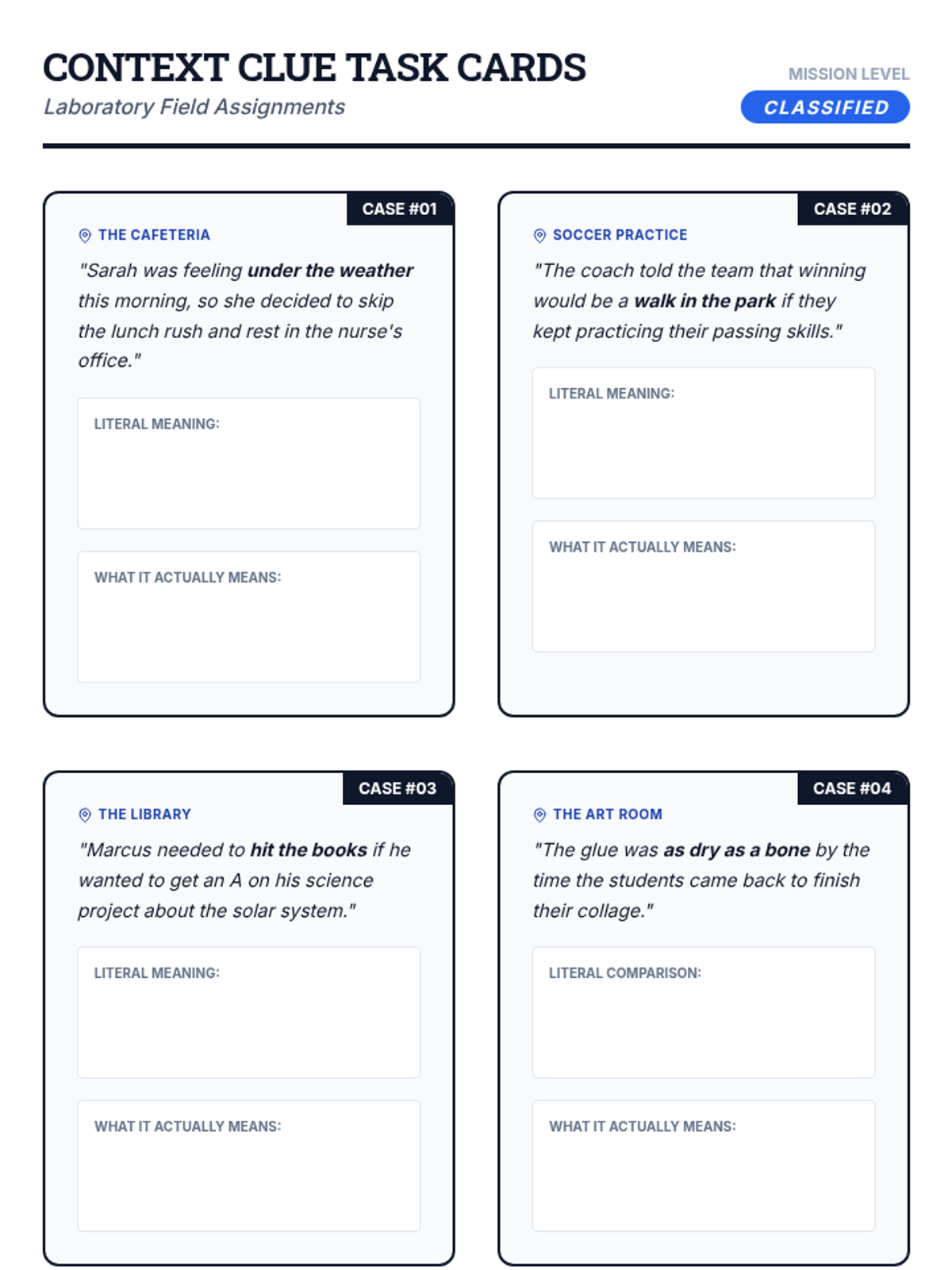 A set of 6 scenario-based task cards. Revised for better page flow, larger student work areas, and more distinct multiple-meaning words.