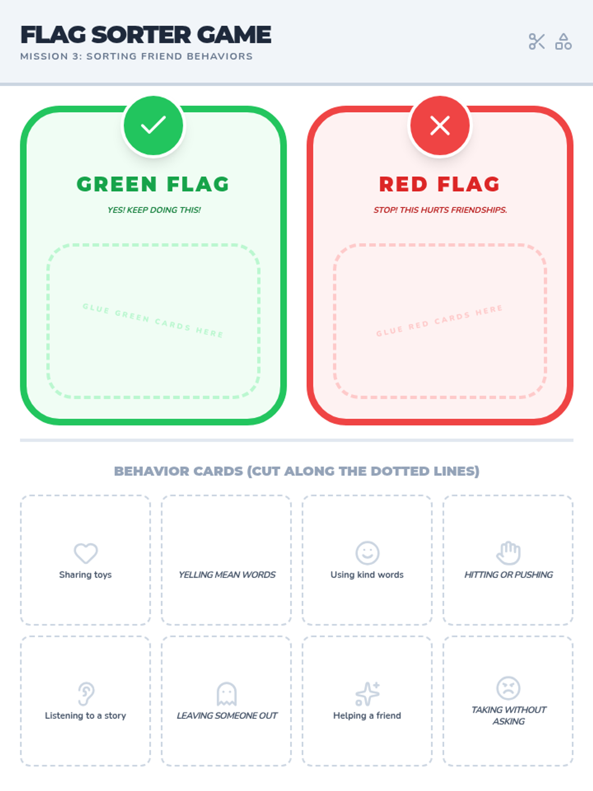 A printable sorting game with behavior cards and category mats to help students distinguish between healthy and unhealthy relationship traits.