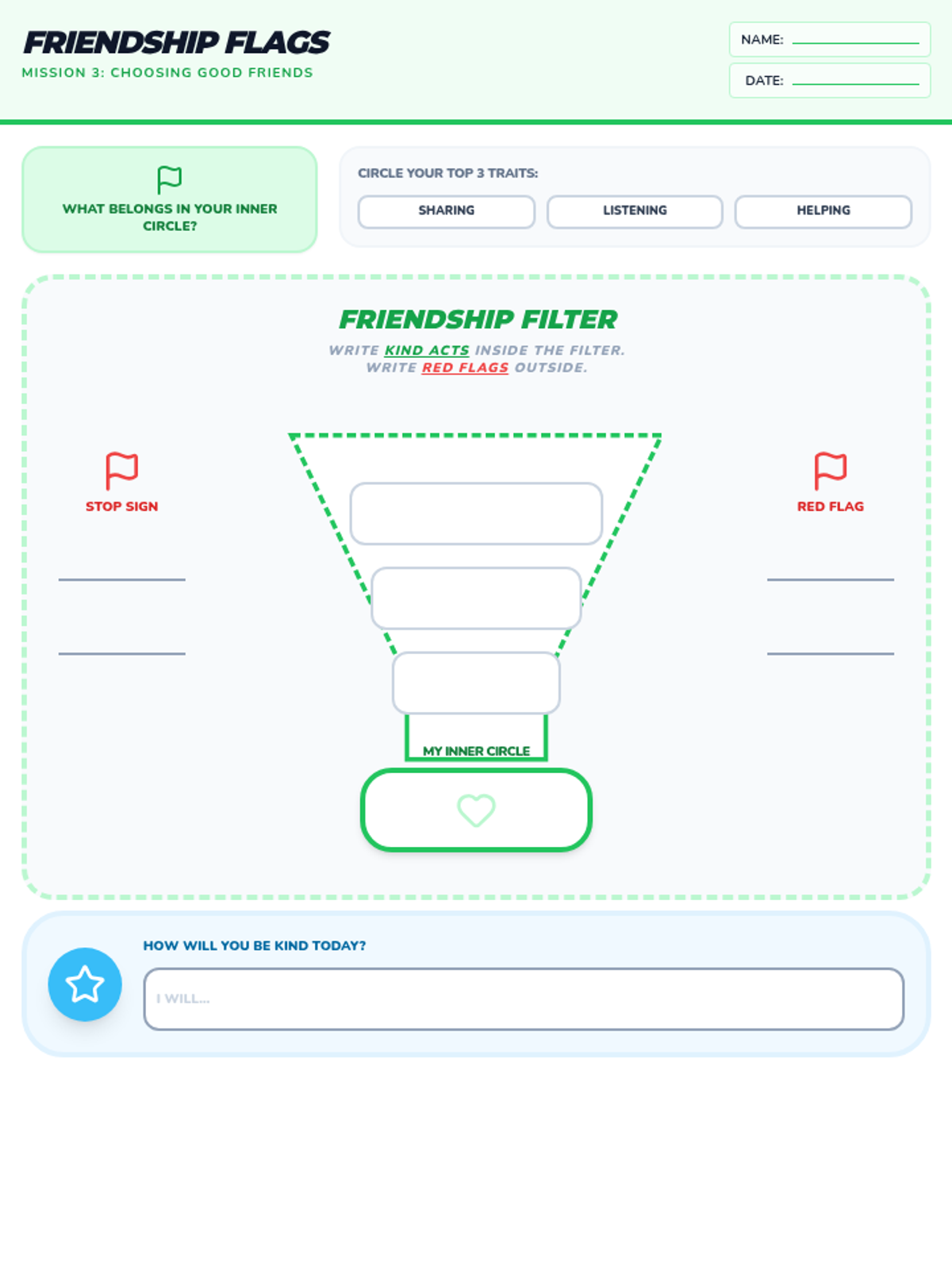 A compact worksheet and art project focused on helping students identify healthy friendship qualities (Green Flags) and warning signs (Red Flags) on a single page.