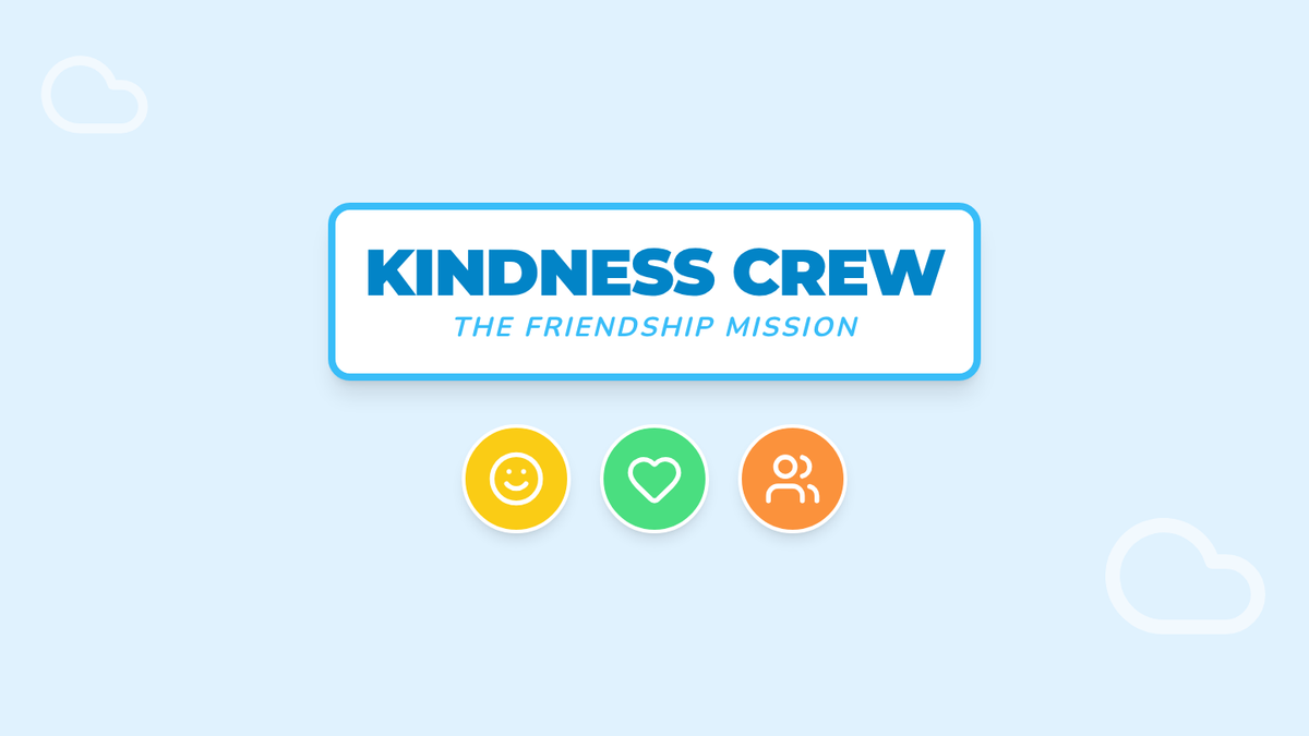 An introductory slide deck for the Kindness Crew curriculum, designed to engage students in grades 1-3 with vibrant visuals and simple concepts about friendship and active listening.