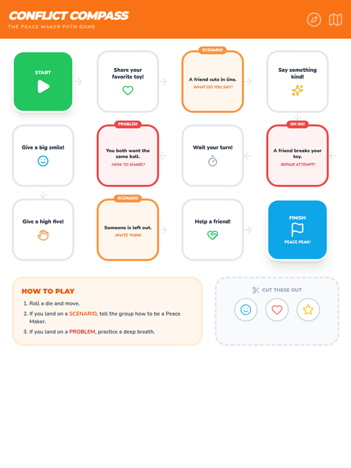 A printable board game designed to help students practice conflict resolution strategies and perspective-taking through various scenarios.