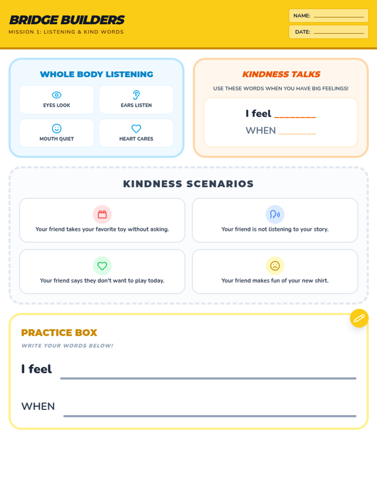 A compact reference sheet and role-play scenario cards for practicing active listening and "I" statements, designed to fit on a single page.