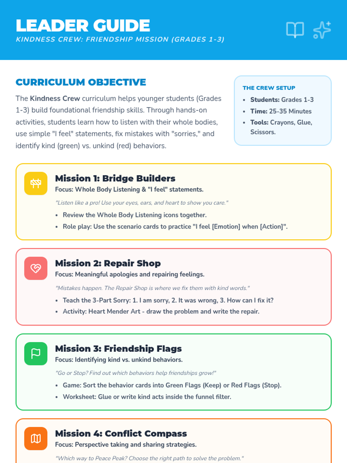 A comprehensive teacher's guide for the 4-lesson curriculum, providing lesson objectives, discussion prompts, and activity instructions.
