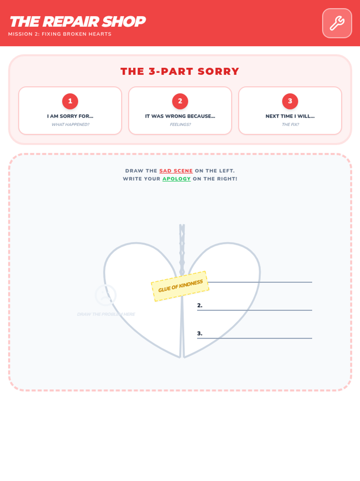 A single-page worksheet focusing on the 4 parts of a meaningful apology and an art activity for reconciliation.