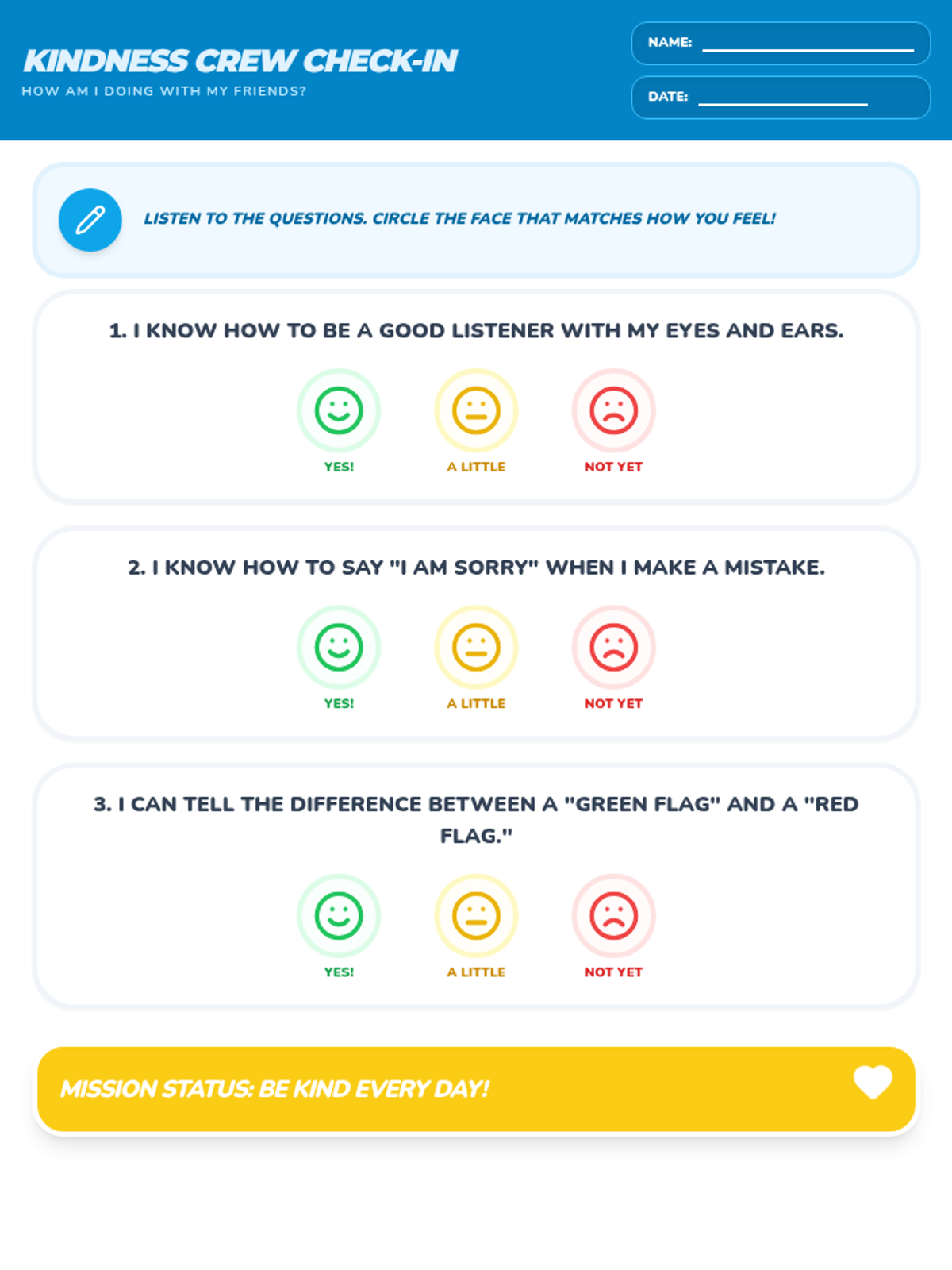 A pre- and post-test designed to measure student growth in identifying friendship traits, using communication tools, and applying conflict resolution strategies.