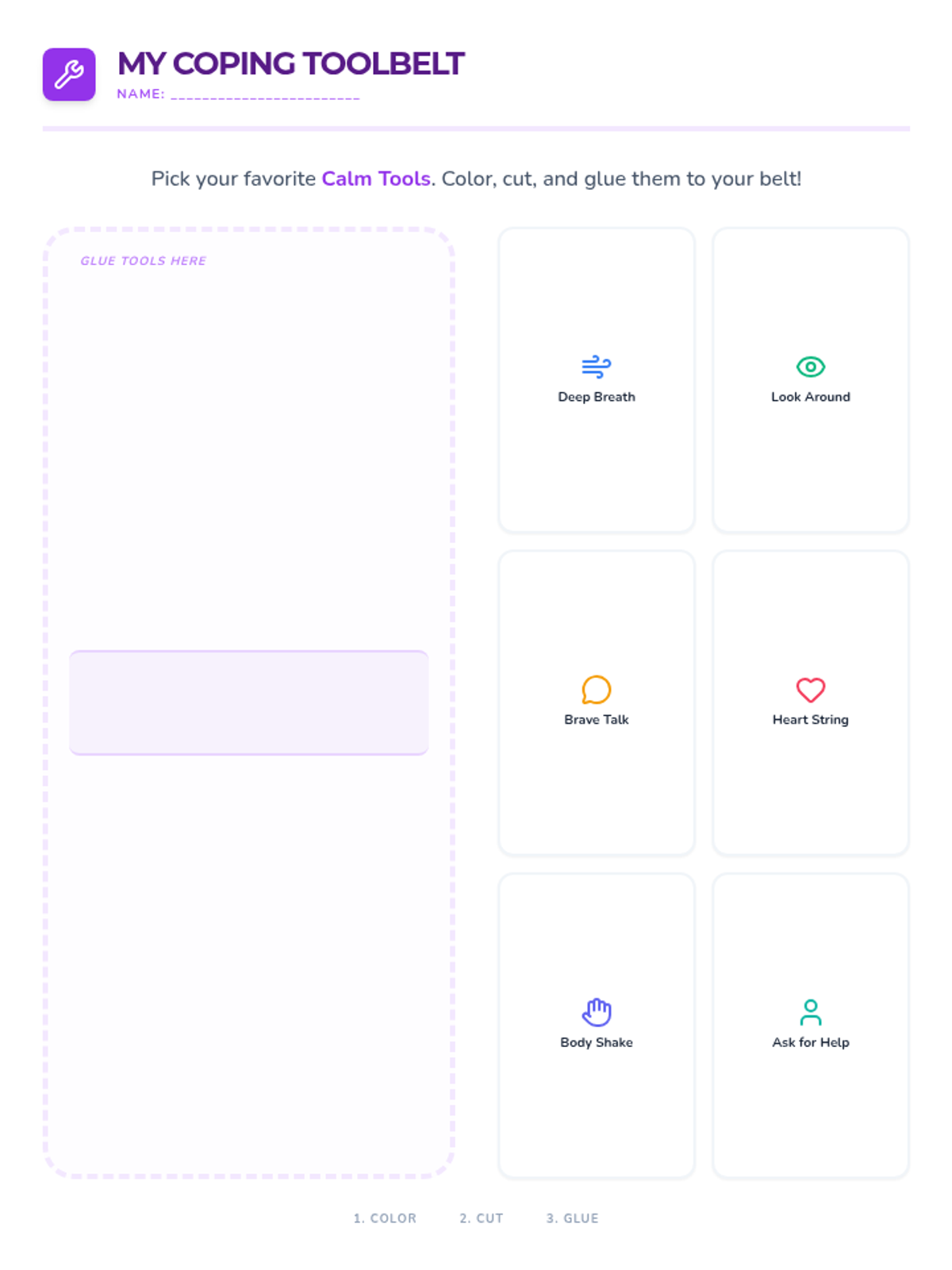 A hands-on activity for 2nd graders to select and 'wear' their coping skills in a visual toolbelt format.