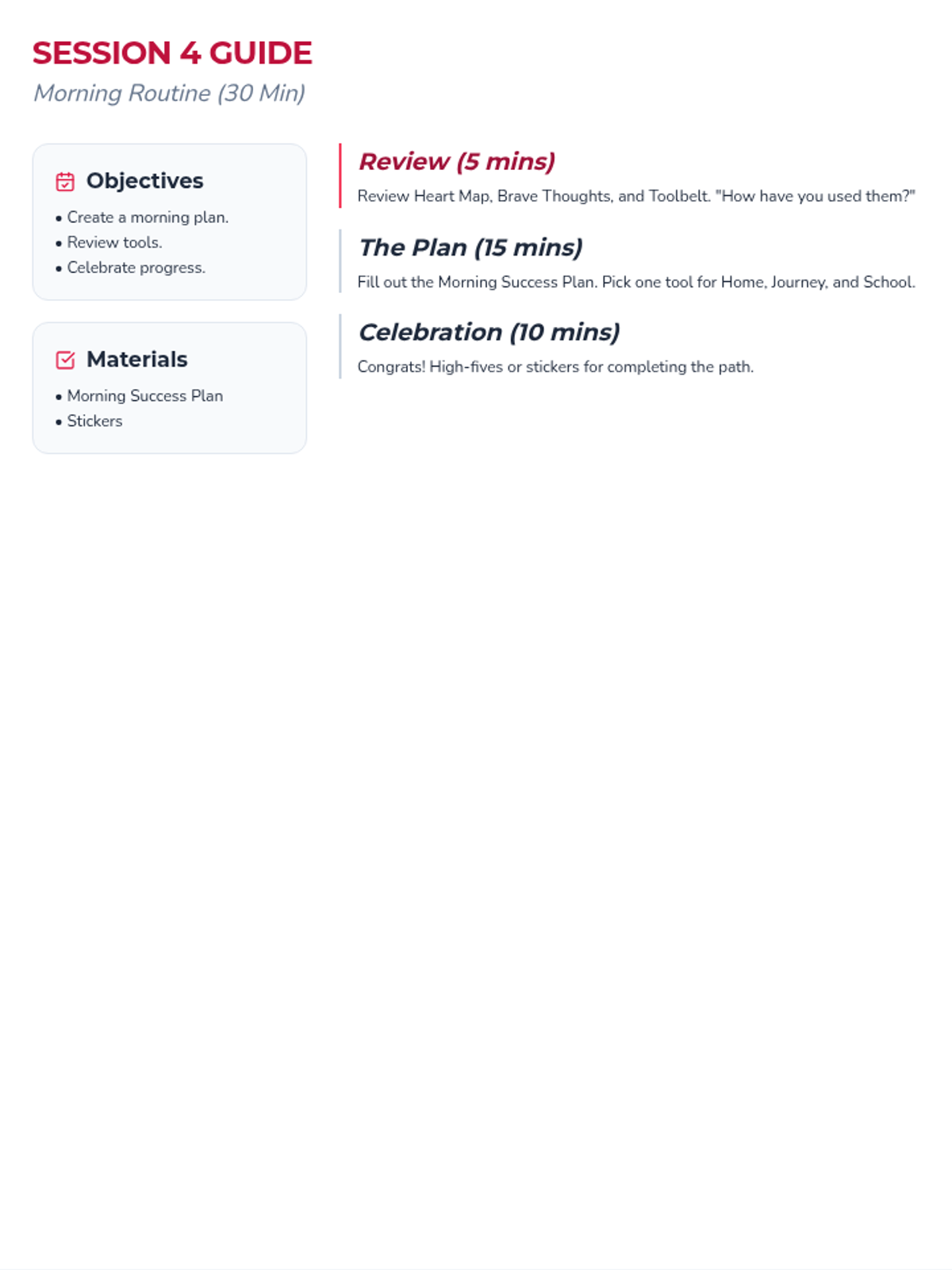 A facilitation guide for the final session, focusing on creating a concrete morning transition plan and celebrating the student's progress.