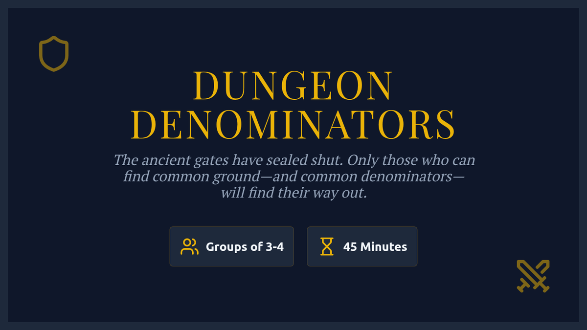 An immersive slide deck that introduces the "Dungeon Denominators" escape room theme, sets the rules, and outlines the objectives for the collaborative activity.