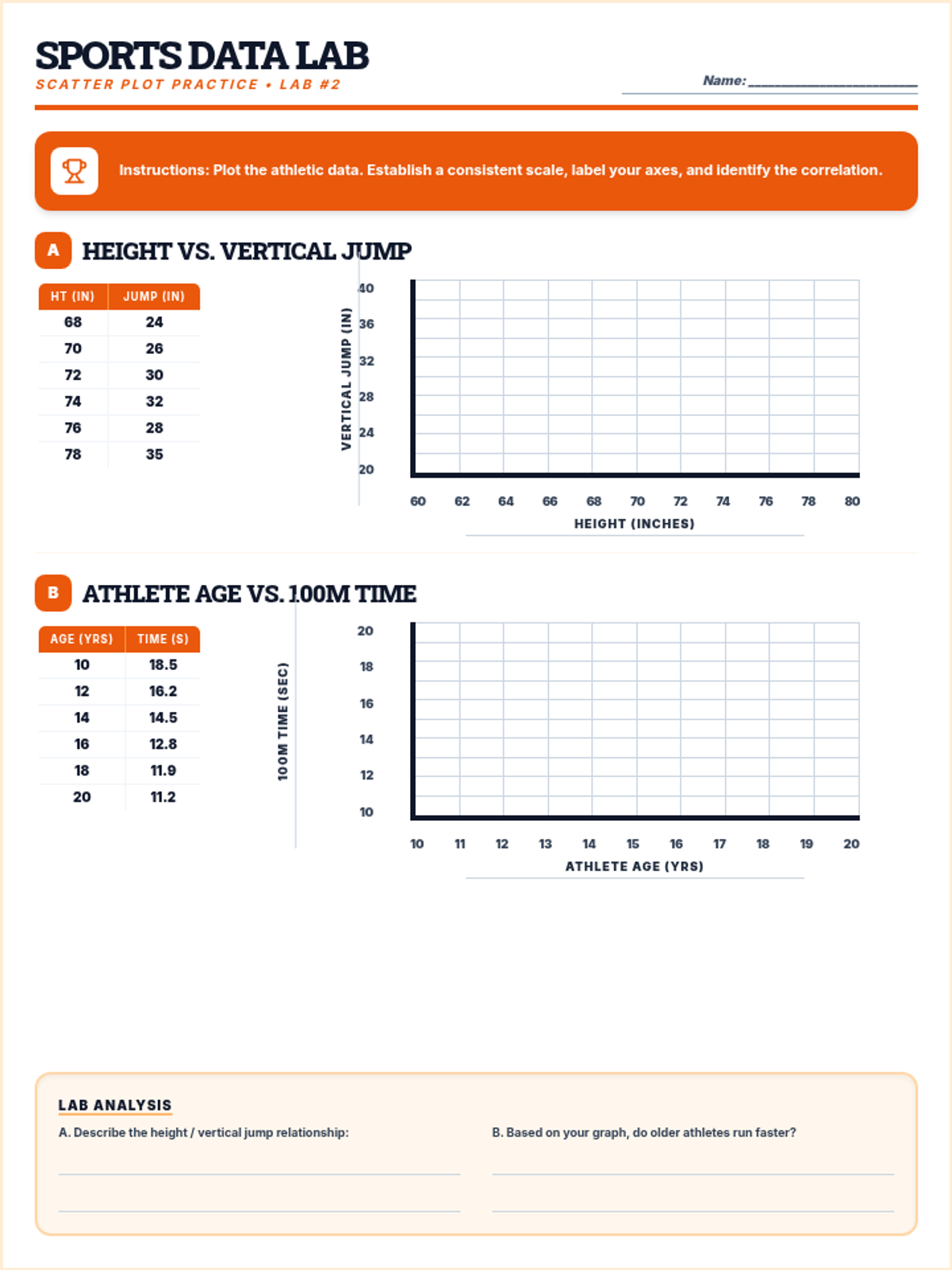A specialized practice worksheet focused on sports-related bivariate data, including Height vs. Vertical Jump and Athlete Age vs. Sprint Time. Now with a full 10x10 grid on each coordinate plane.