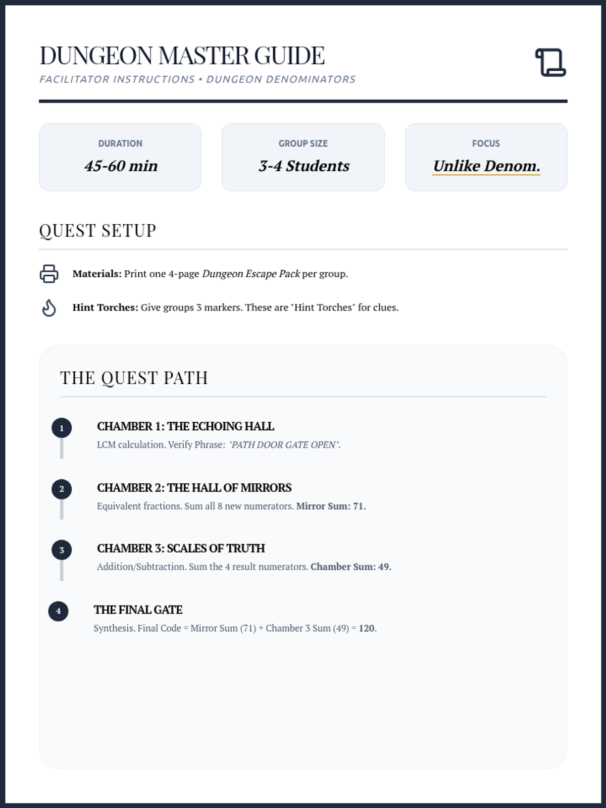 A comprehensive teacher facilitation guide for the "Dungeon Denominators" escape room, including setup instructions, pacing tips, gameplay flow, and helpful clues for students.