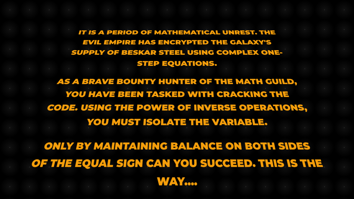 A visually striking presentation with Mandalorian themes to introduce one-step multiplication and division equations. Includes a narrative intro with a scrolling Star Wars-style crawl, conceptual explanations, and guided practice.