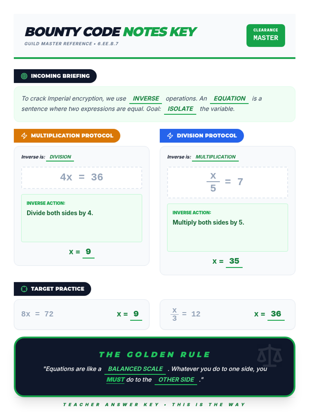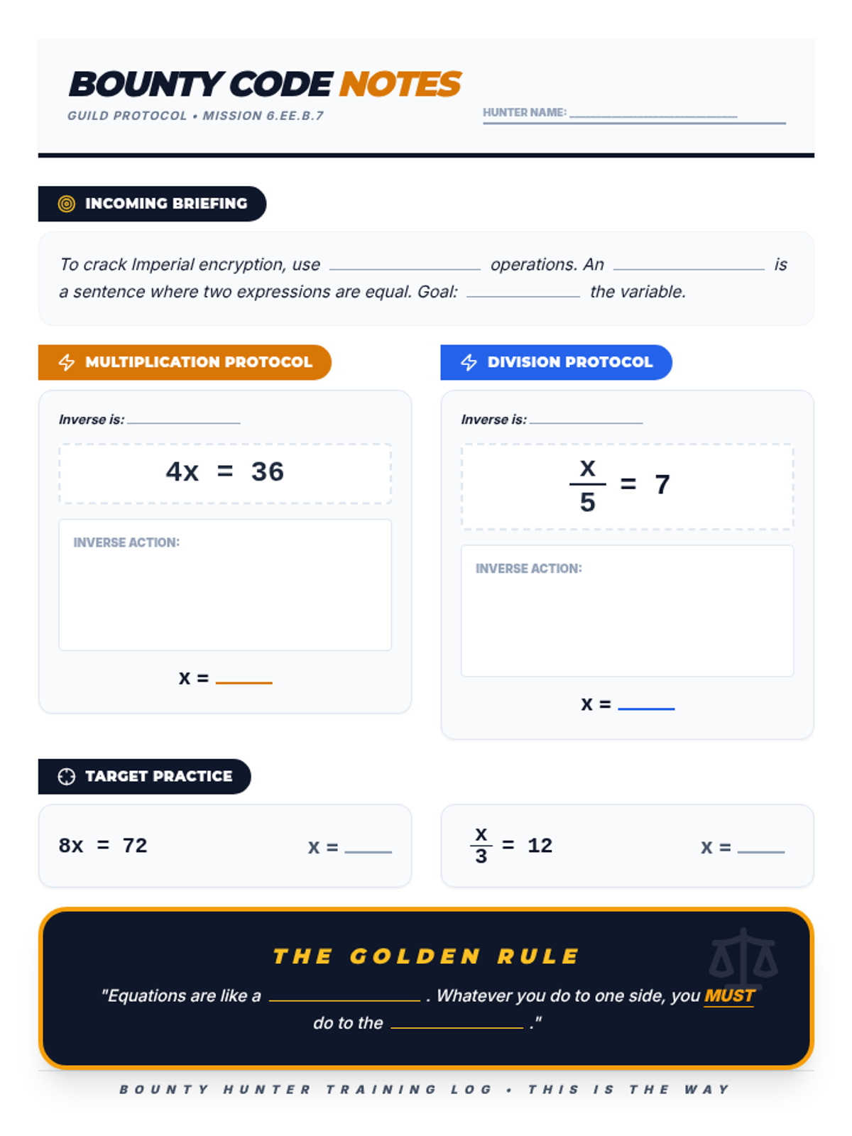A cloze-style guided note sheet for students to fill out during the presentation. Restructured to follow the updated Beskar Equations Slides, including sections for briefing, multiplication, division, and target practice. Optimized to fit on a single page.