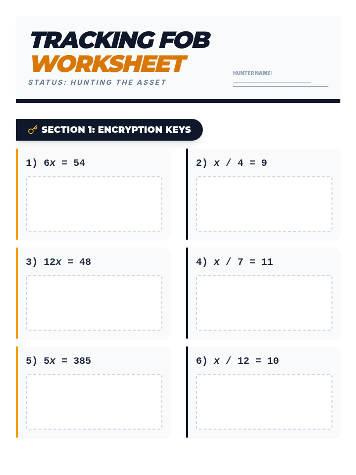 A complete answer key for the Tracking Fob Worksheet, featuring clear solutions and the final puzzle answer for teacher use.