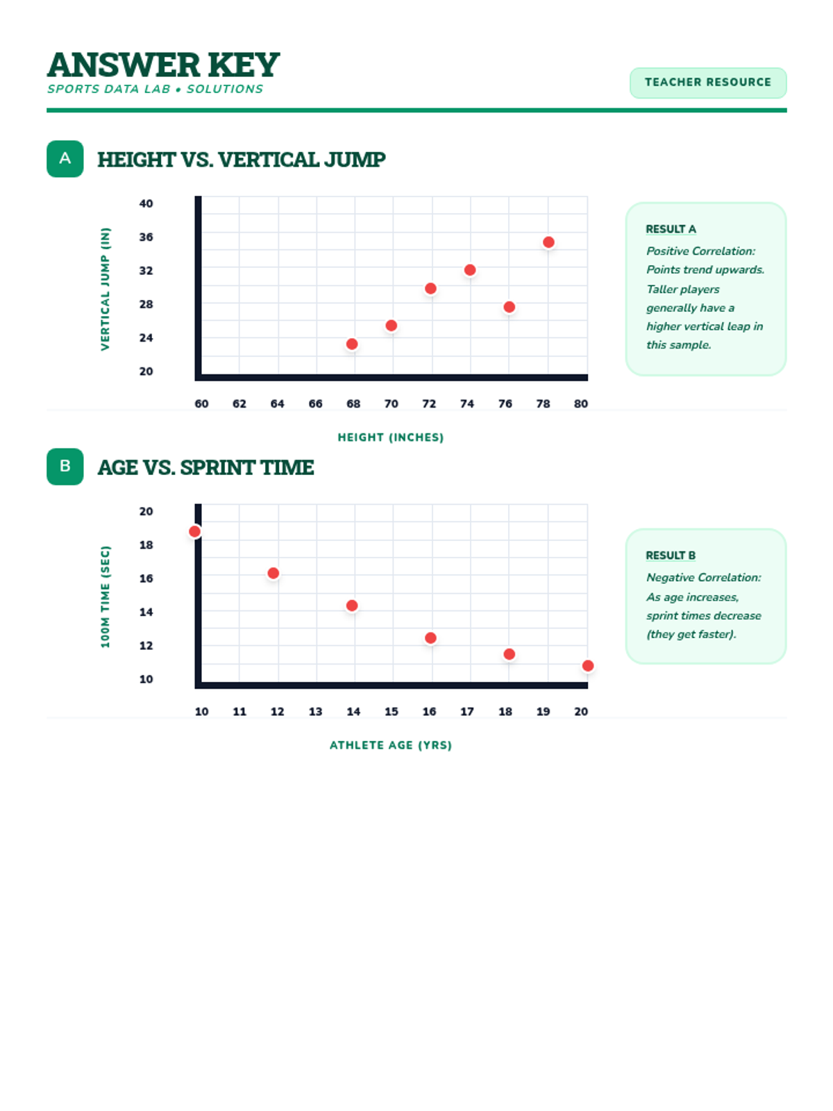 A teacher's answer key for the Sports Data Lab scatter plot worksheet, with correctly plotted points and trend analysis. Now with full coordinate grid lines for precise grading.
