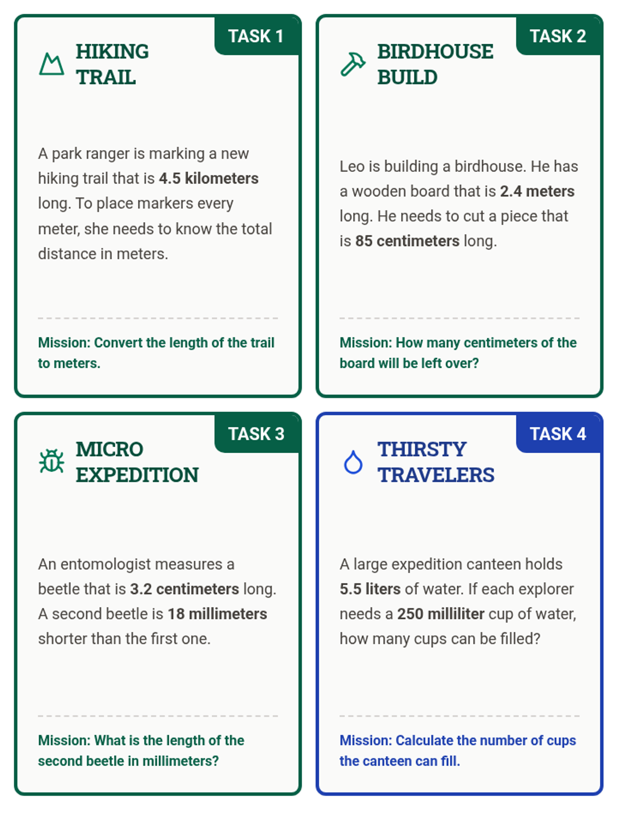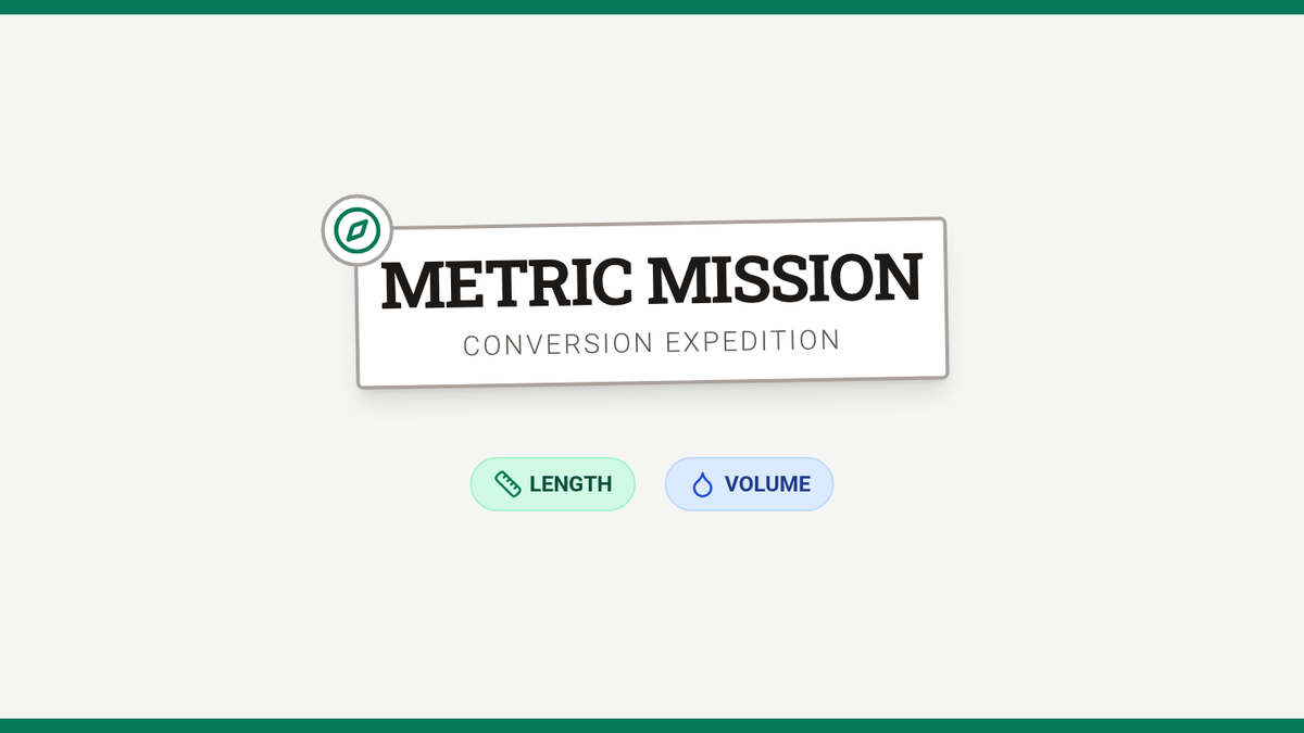 An introductory presentation for metric conversions (length and liquid volume) featuring a field expedition theme, visual conversion guides, and a mission briefing for the task card activity.