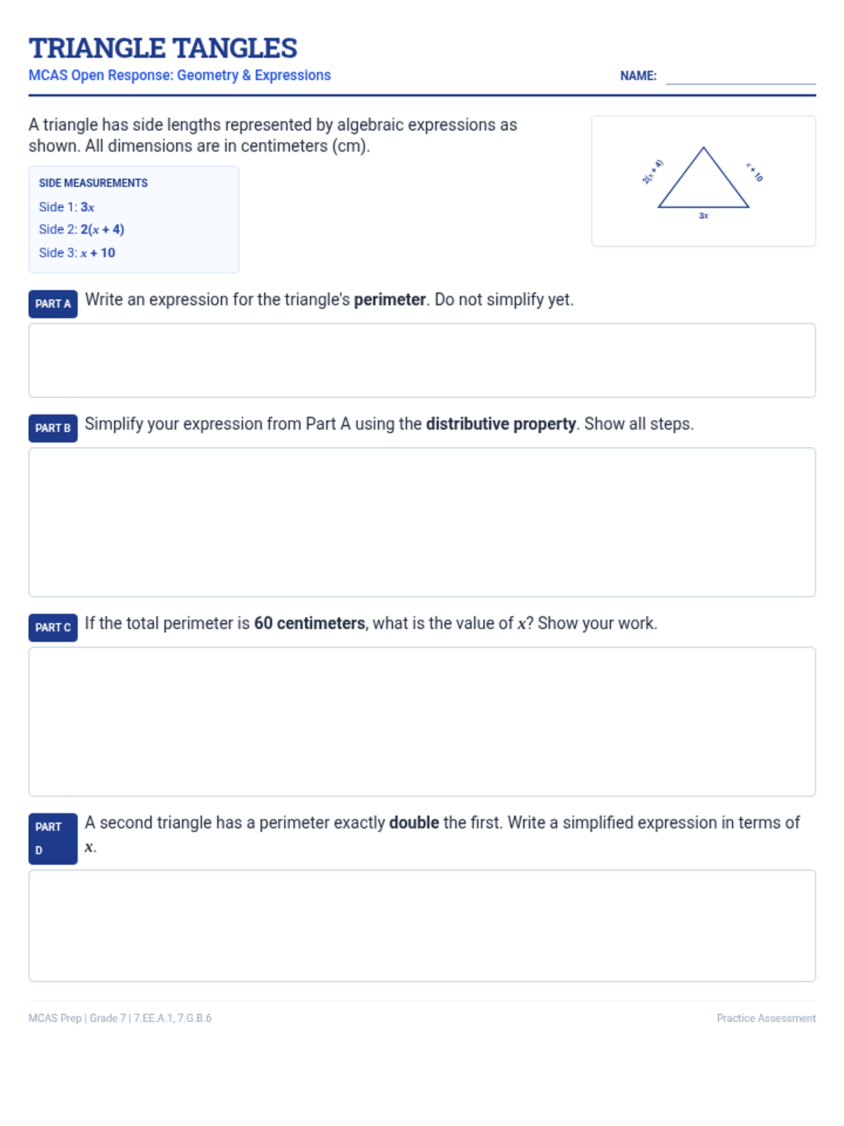 An MCAS-style open response worksheet focusing on a triangle perimeter problem that requires the use of the distributive property and solving for a variable.