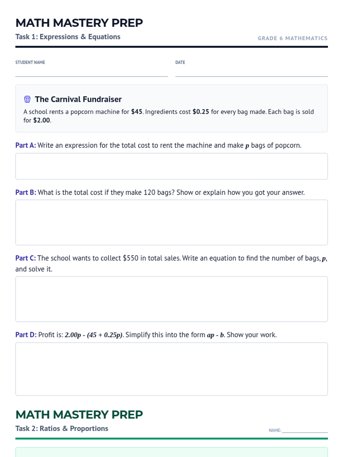 A combined 6th-grade math practice packet featuring two MCAS-style open-response questions on expressions/equations and ratios/proportions. Each question has four distinct parts and dedicated space for student work.