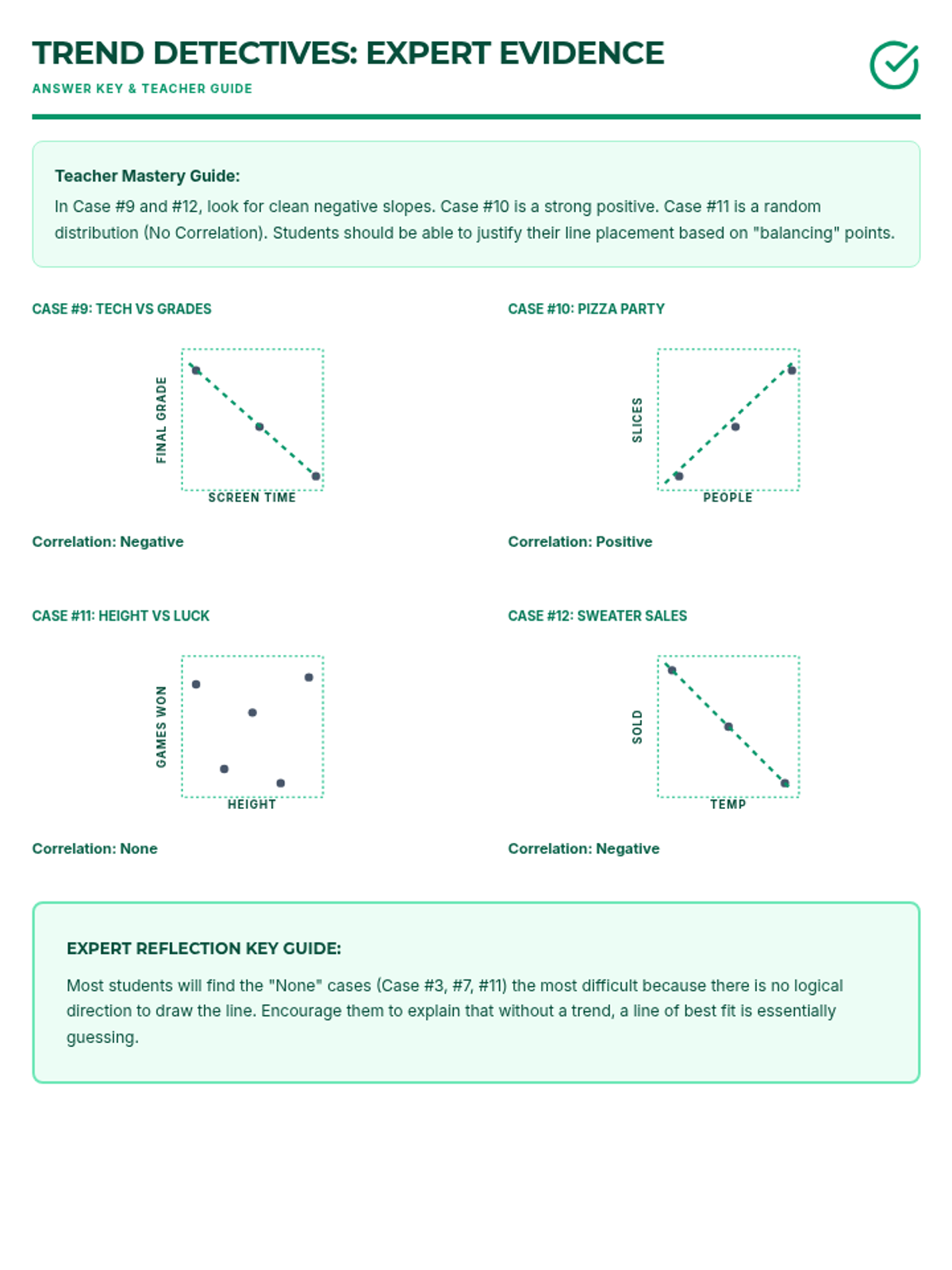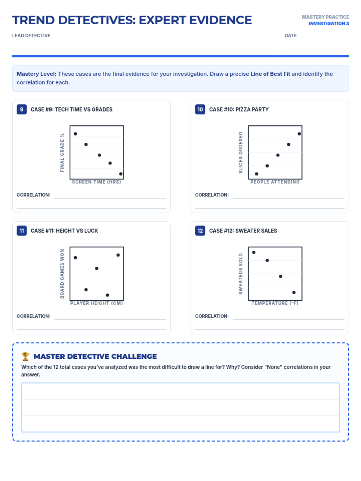 A third practice worksheet for scatter plots featuring mastery-level cases (Case 9-12) to wrap up the Trend Detectives investigation.
