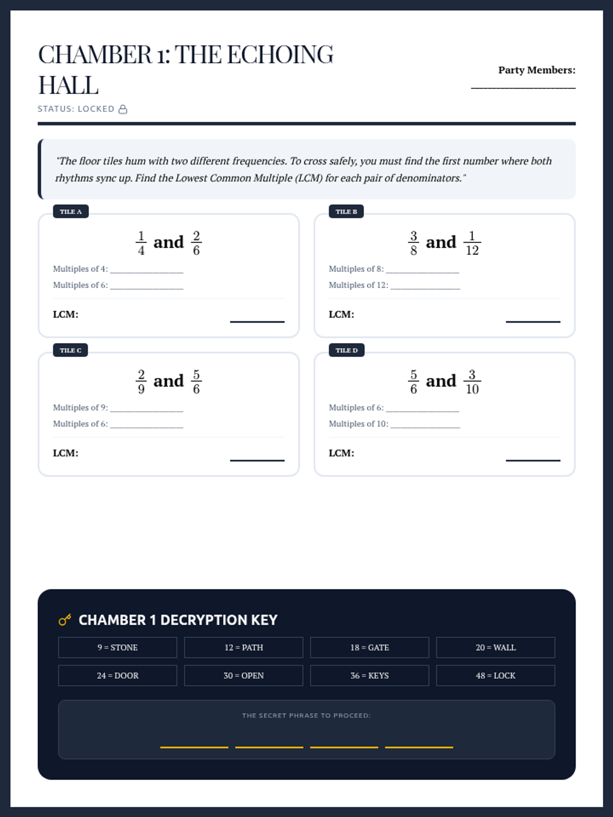 A comprehensive multi-chamber student activity pack featuring four progressive puzzles that require finding common denominators, creating equivalent fractions, and solving addition/subtraction problems to escape the dungeon.