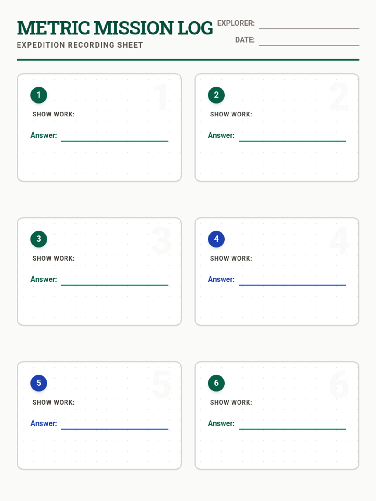A structured recording sheet for students to document their work and final answers for the 12 Metric Mission task cards. Includes designated areas for showing work and a final "mission complete" checklist.