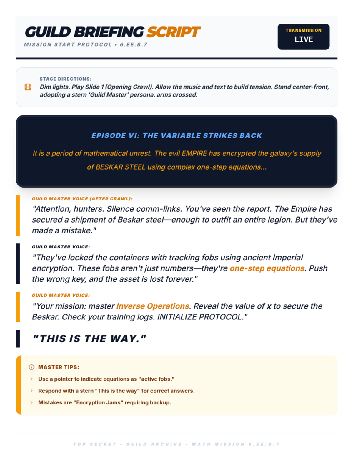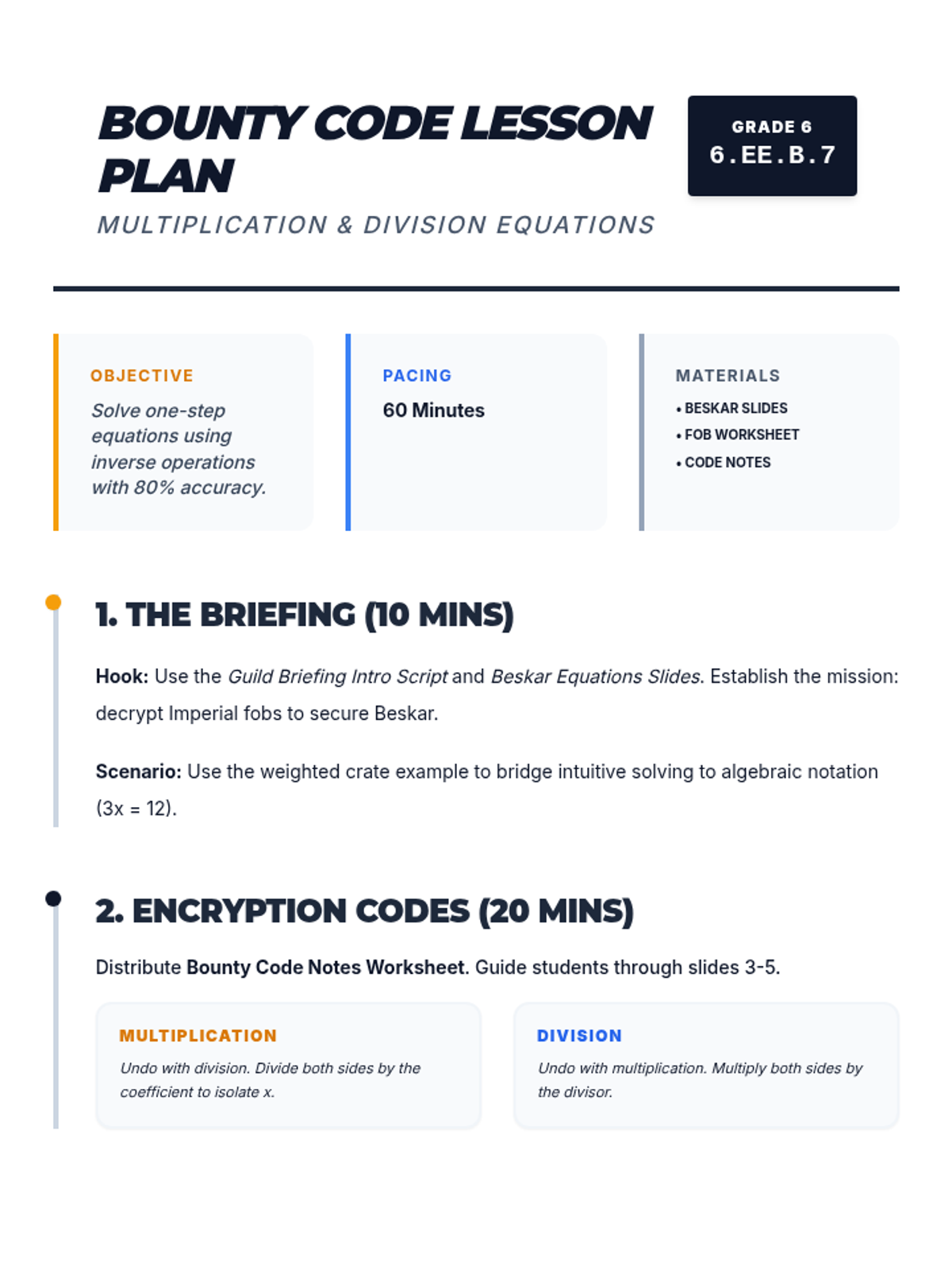 A comprehensive teacher guide for leading a 60-minute lesson on one-step multiplication and division equations using a Mandalorian theme.