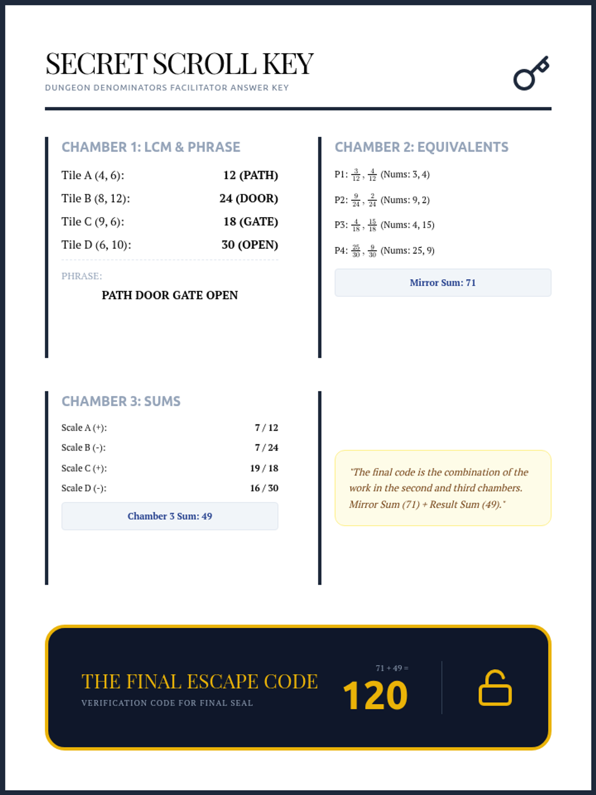 A clear and concise answer key for the "Dungeon Denominators" escape room, providing step-by-step solutions for LCMs, equivalent fractions, sums, and the final escape code.