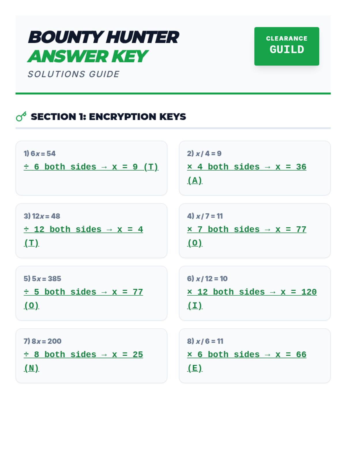 A comprehensive answer key for the Bounty Code Notes Worksheet, providing all necessary cloze fill-ins and mathematical solutions for teacher use during the presentation.