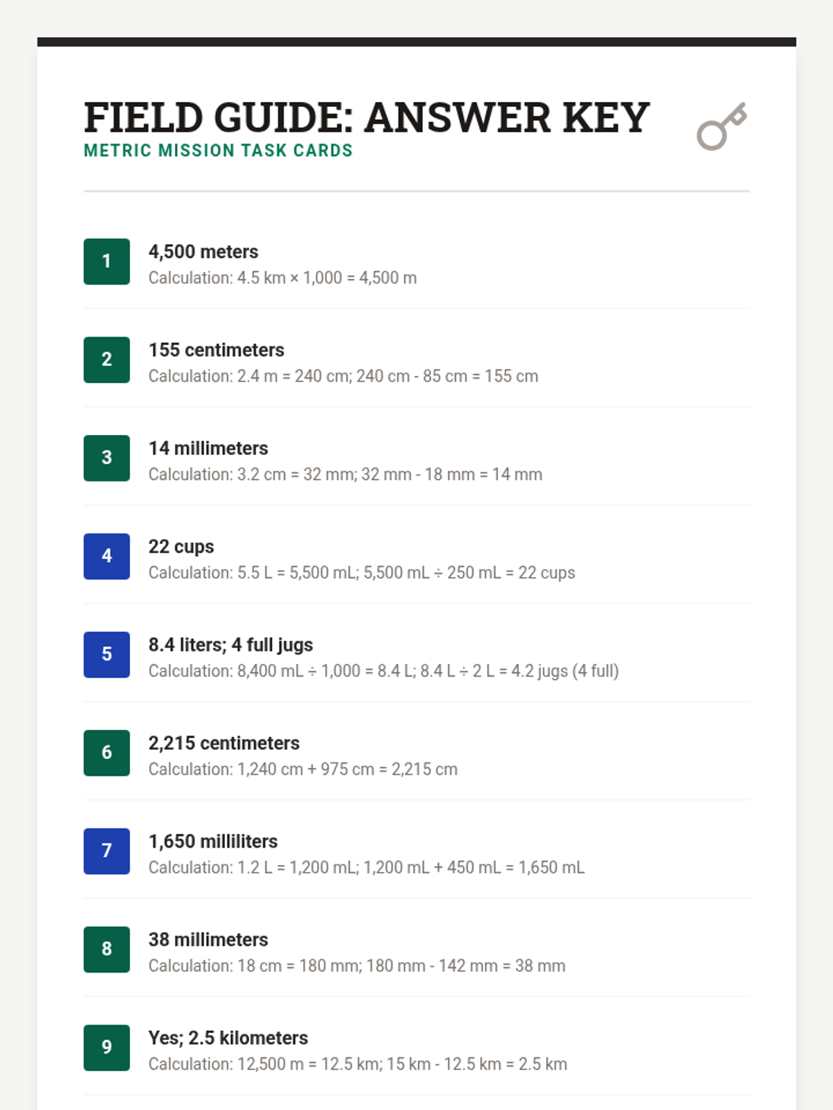 A teacher's answer key for the Metric Mission task cards, providing final answers and step-by-step calculations for both length and volume problems.