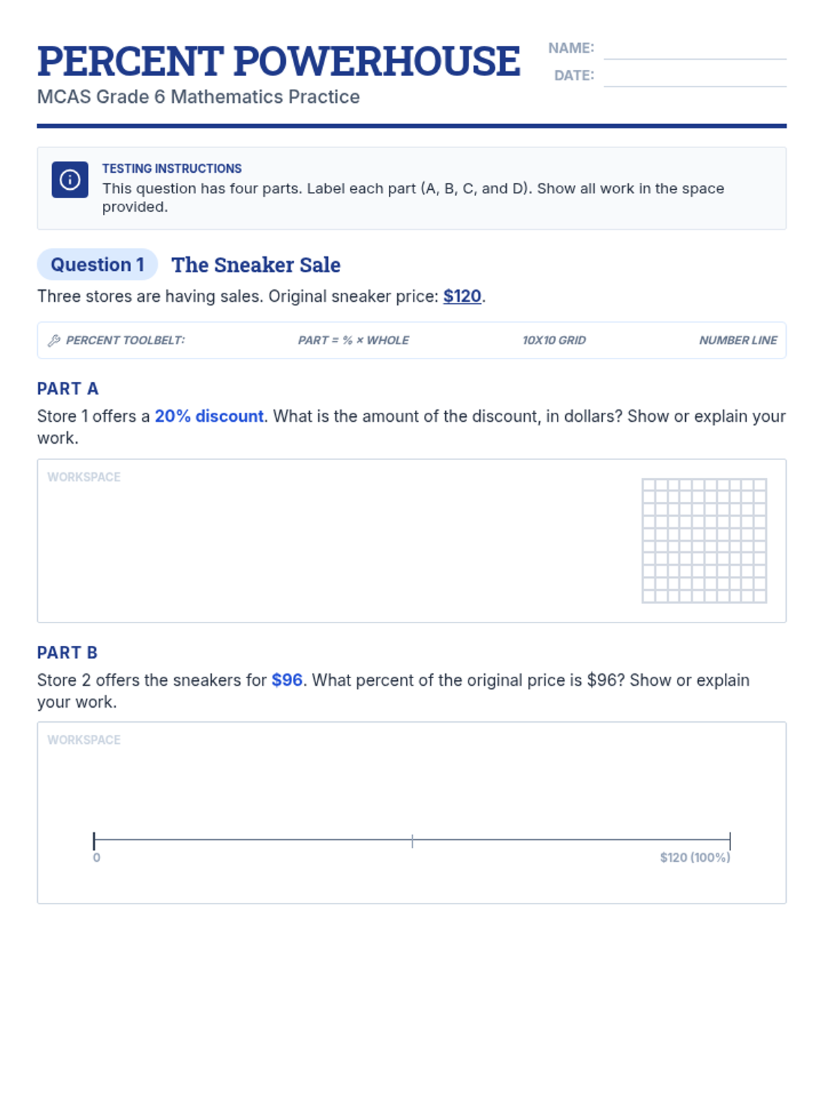 A Grade 6 MCAS-style open response worksheet on percentages featuring a shopping scenario with four distinct parts and a scaffolding 'toolbelt' for students.