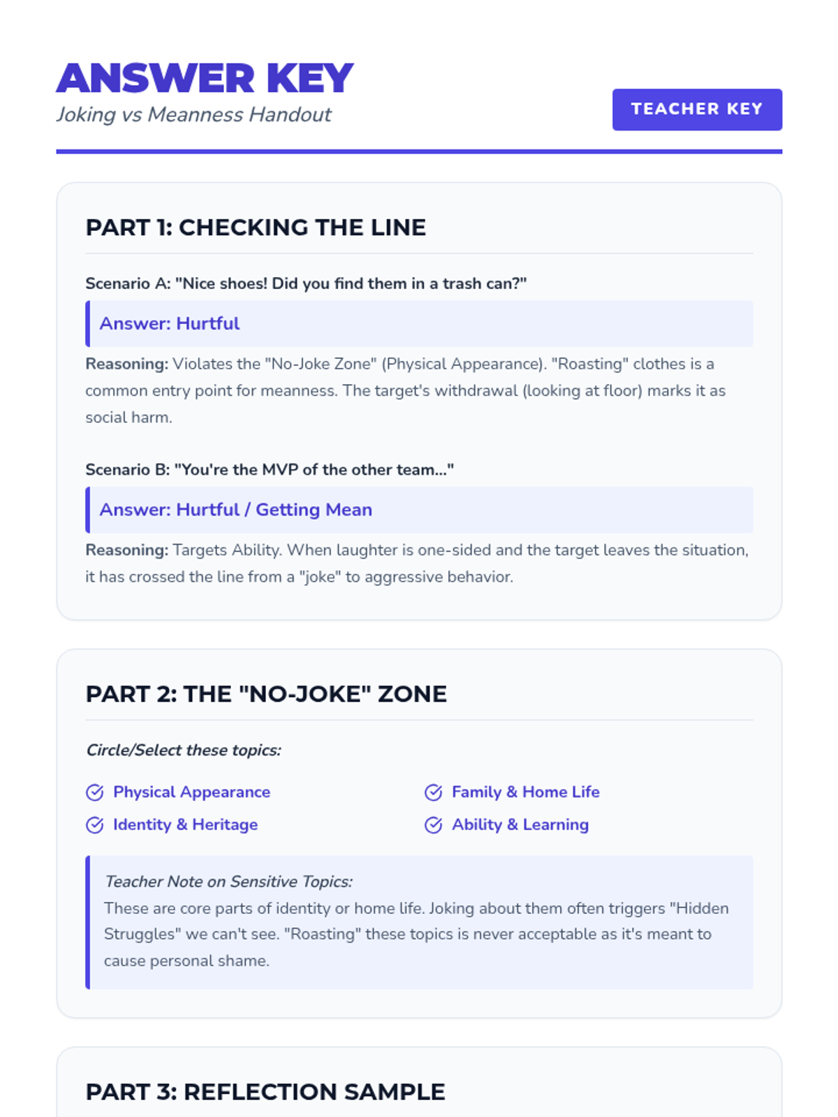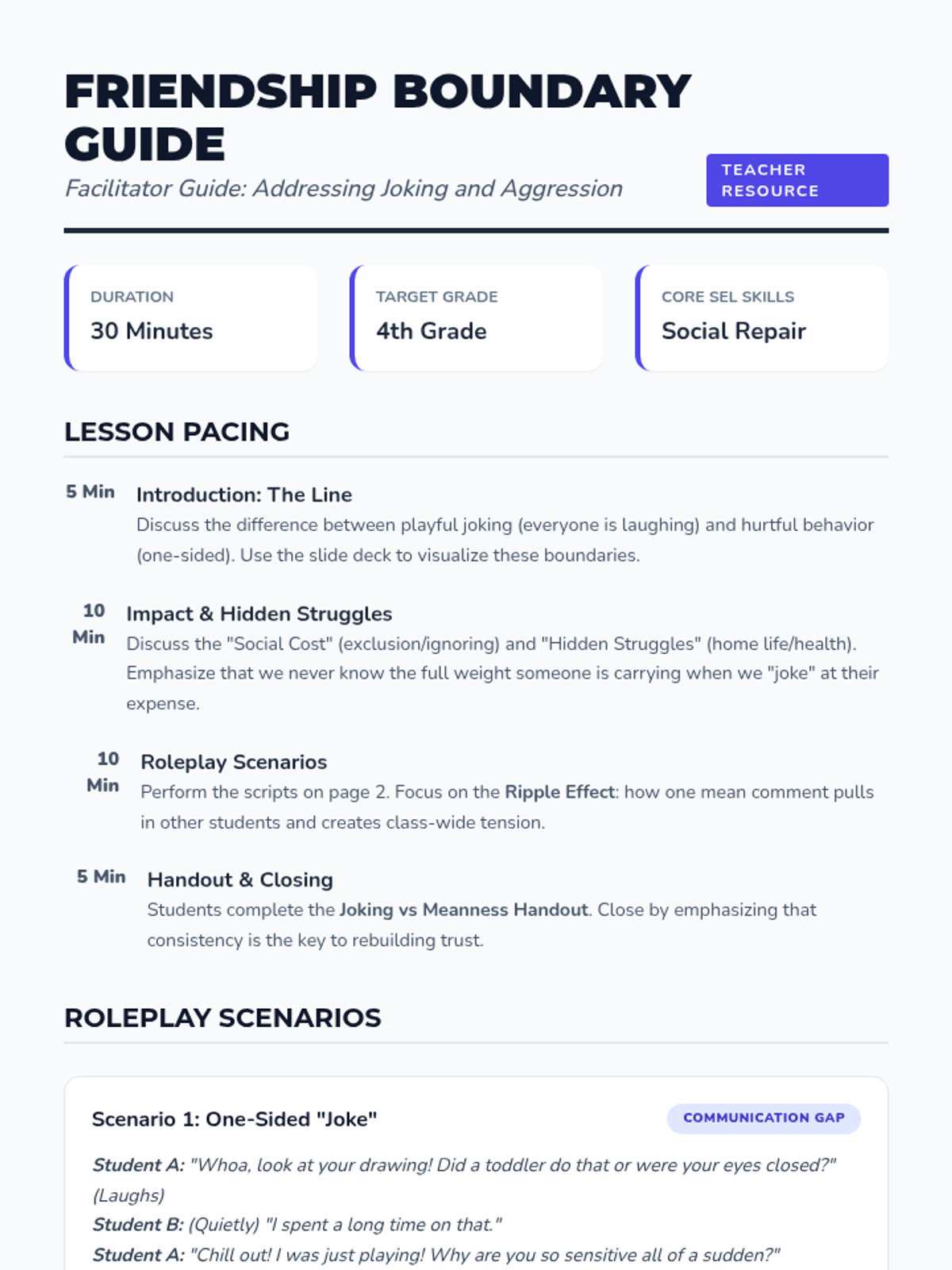 A teacher's guide for a 4th-grade SEL lesson on joking vs. meanness. Updated with neutral professional styling, improved page breaks for scenarios, and higher contrast text. Now explicitly references the "No-Joke Zone" and "Joking vs Meanness Answer Key".