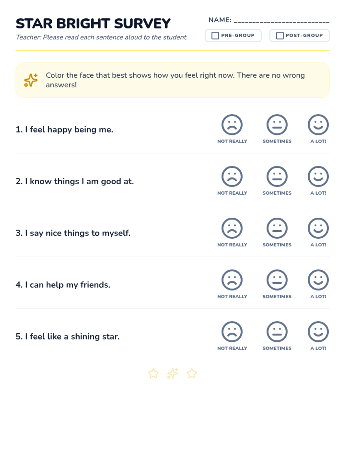 A visual emoji-based survey for K-1 students to assess their self-esteem and self-worth before and after the 4-week program. Designed for teacher read-aloud administration. Revised for improved print contrast and layout.