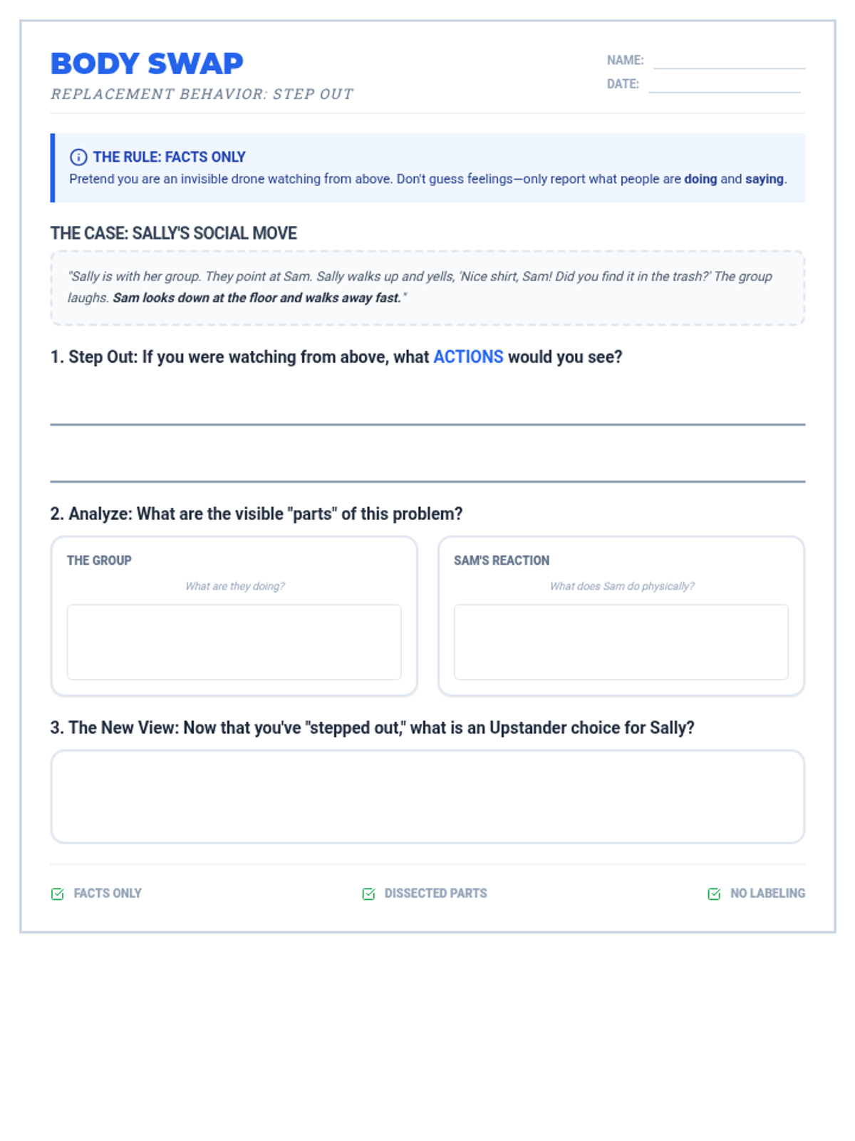 A revised student-facing worksheet for practicing the 'Step Out of Your Body' technique using the Sally case study. It guides students to observe social scenarios objectively and analyze visible actions. Optimized for 3rd-grade handwriting with larger response areas and fixed page breaks.