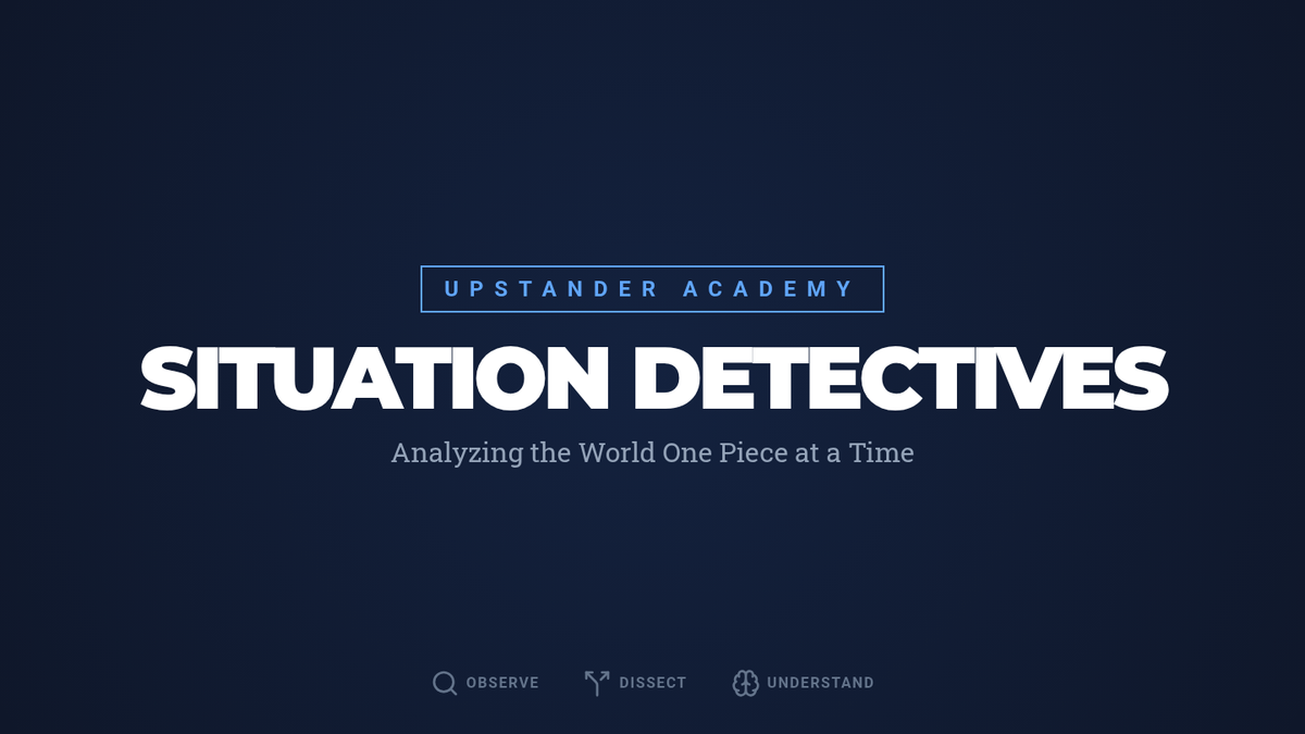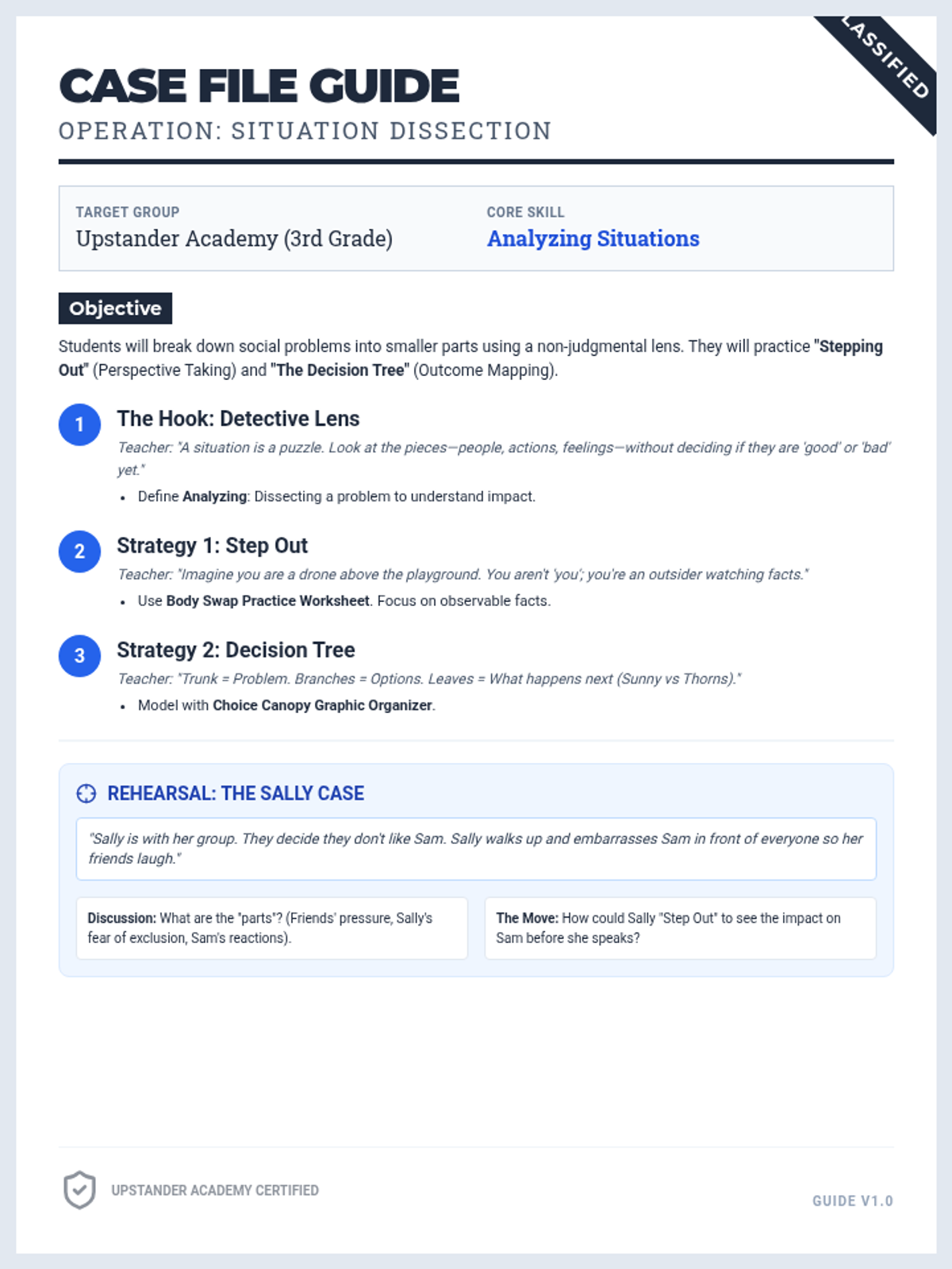 A comprehensive teacher's guide for the Situation Detectives lesson, featuring a structured instructional script, core definitions, and a detailed case study rehearsal application for Upstander Academy. This version is optimized for single-page printing.