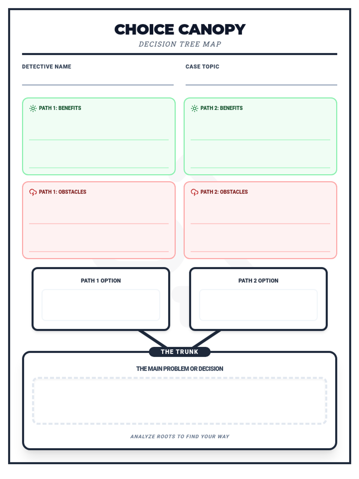 A final polished version of the Choice Canopy graphic organizer. It features improved contrast for metadata labels, larger writing spaces for outcomes, and a clearer visual flow from the 'Trunk' up through the 'Branches' to the 'Canopy'.