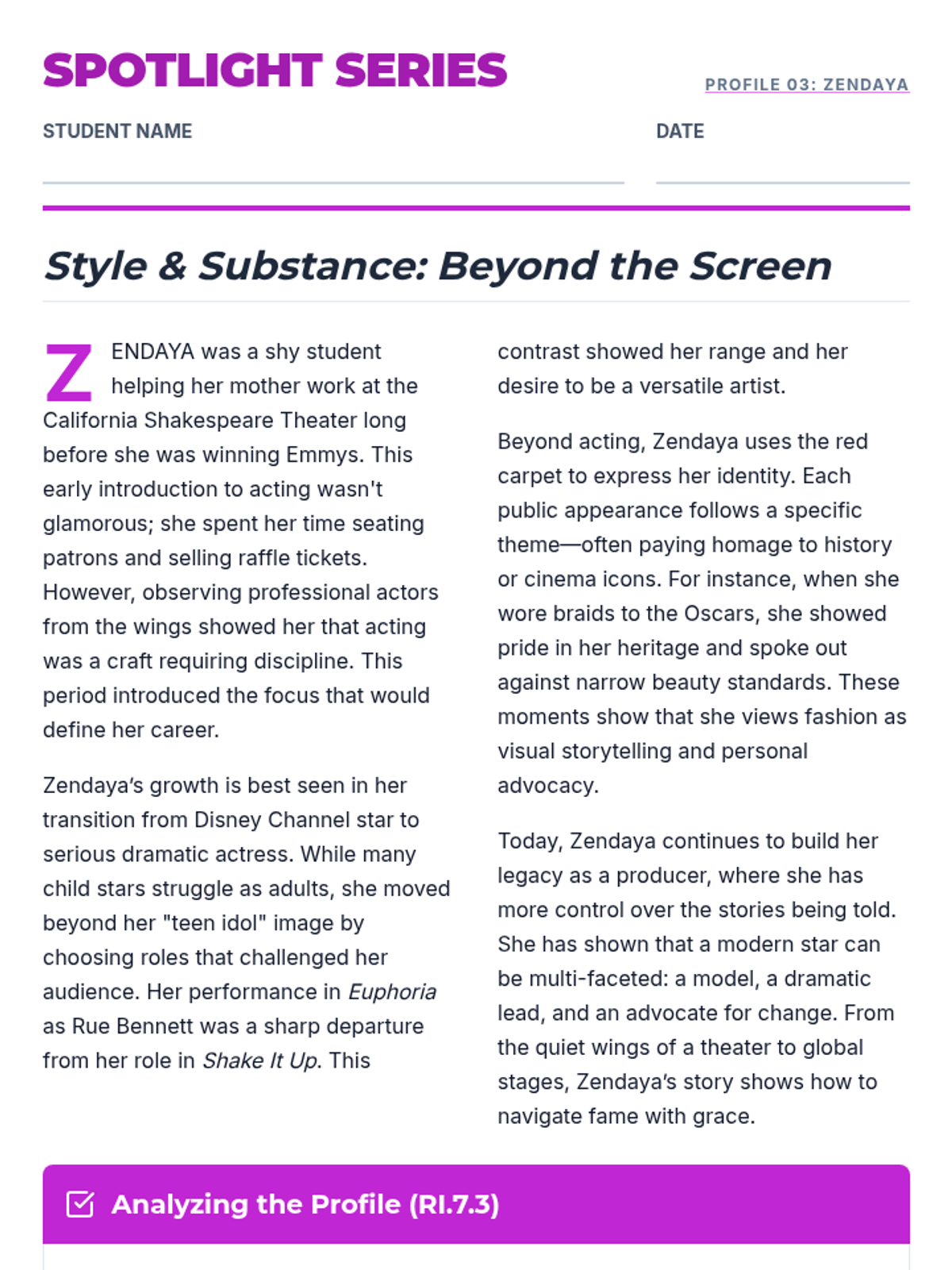 A biography of Zendaya with 10 questions focused on RI.7.3, 7.L.4, and 7.L.5. Optimized for 3 pages. Now includes "teen idol" in the text.