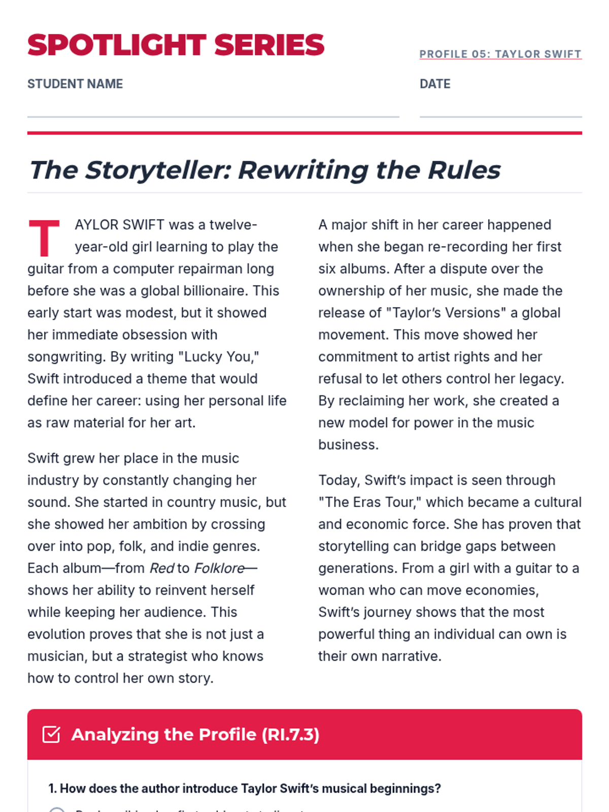 A biography of Taylor Swift with 10 questions focused on RI.7.3, 7.L.4, and 7.L.5, analyzing her songwriting and language use.