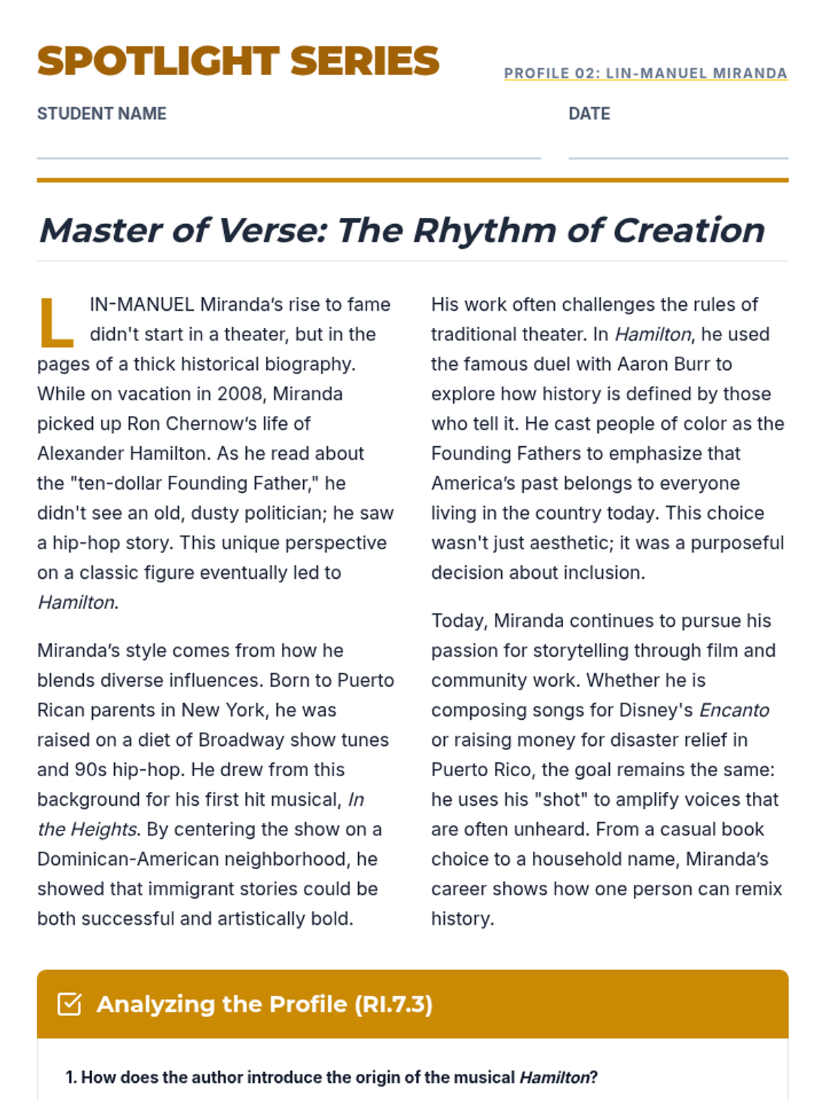 A biography of Lin-Manuel Miranda with 10 questions focused on RI.7.3, 7.L.4, and 7.L.5. Optimized for 3 pages.
