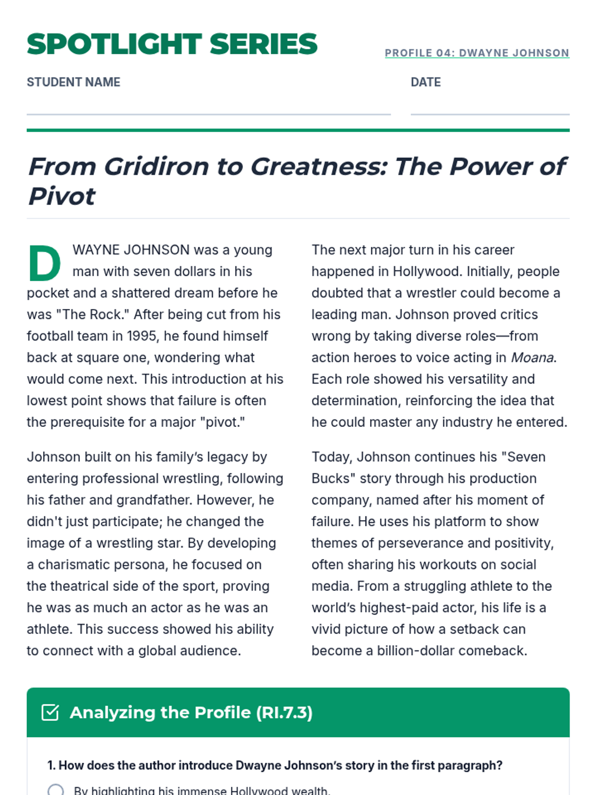 A biography of Dwayne Johnson with 10 questions focused on RI.7.3, 7.L.4, and 7.L.5. Optimized for 3 pages. Varying vocabulary to avoid repetition.