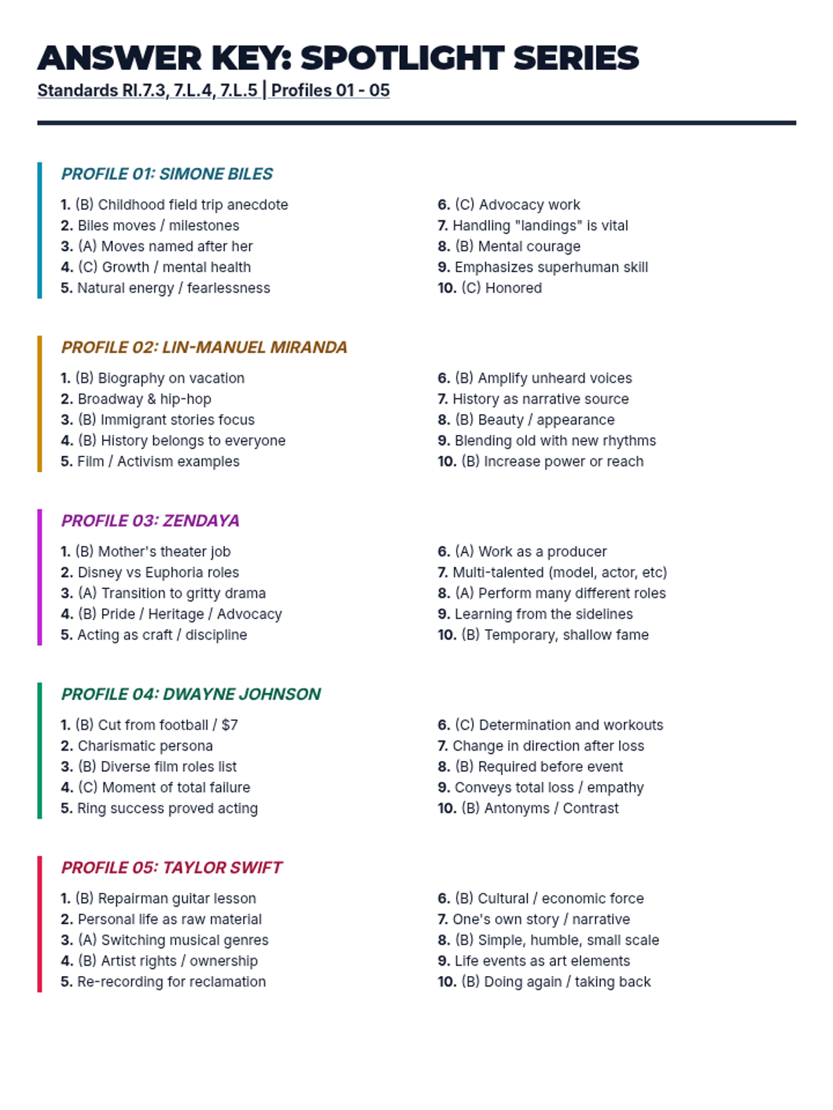 An updated answer key for the Spotlight Series, now including answers for questions aligned with RI.7.3, 7.L.4, and 7.L.5.