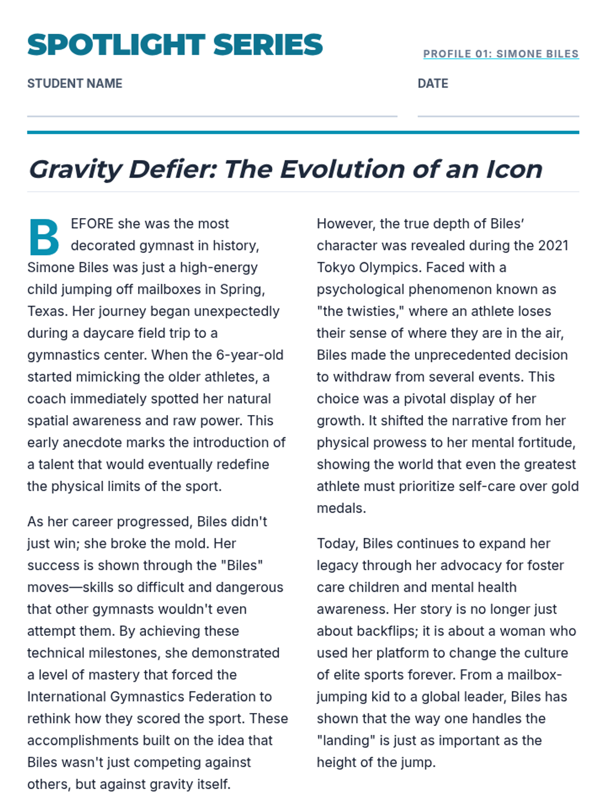 A biography of Simone Biles with 10 questions focused on RI.7.3, 7.L.4, and 7.L.5, analyzing her career and language nuances. Optimized for 3 pages.