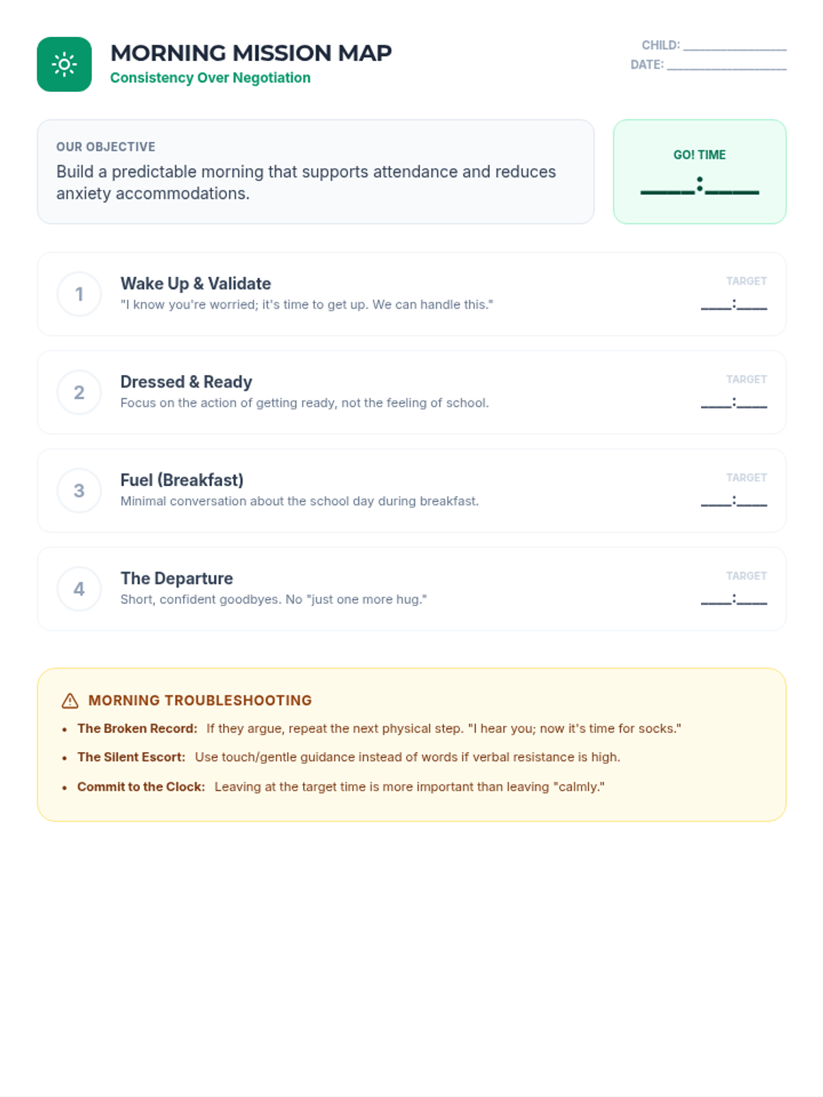 A worksheet for parents to design a consistent morning routine and a systematic exposure ladder to overcome school refusal. Includes target times, troubleshooting tips, and a tiered progress tracker.