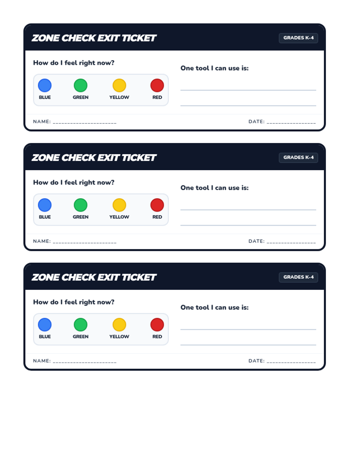 A quick-check formative assessment tool for students to identify their current emotional state and choose a coping strategy, designed with three tickets per page.
