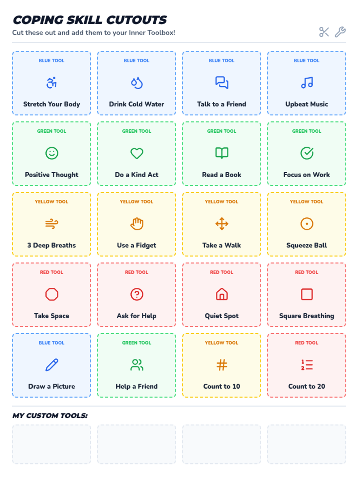 A set of 20 color-coded coping skill cards for students to cut out and use in their regulation toolbox, featuring icons and simple text for all primary grades.