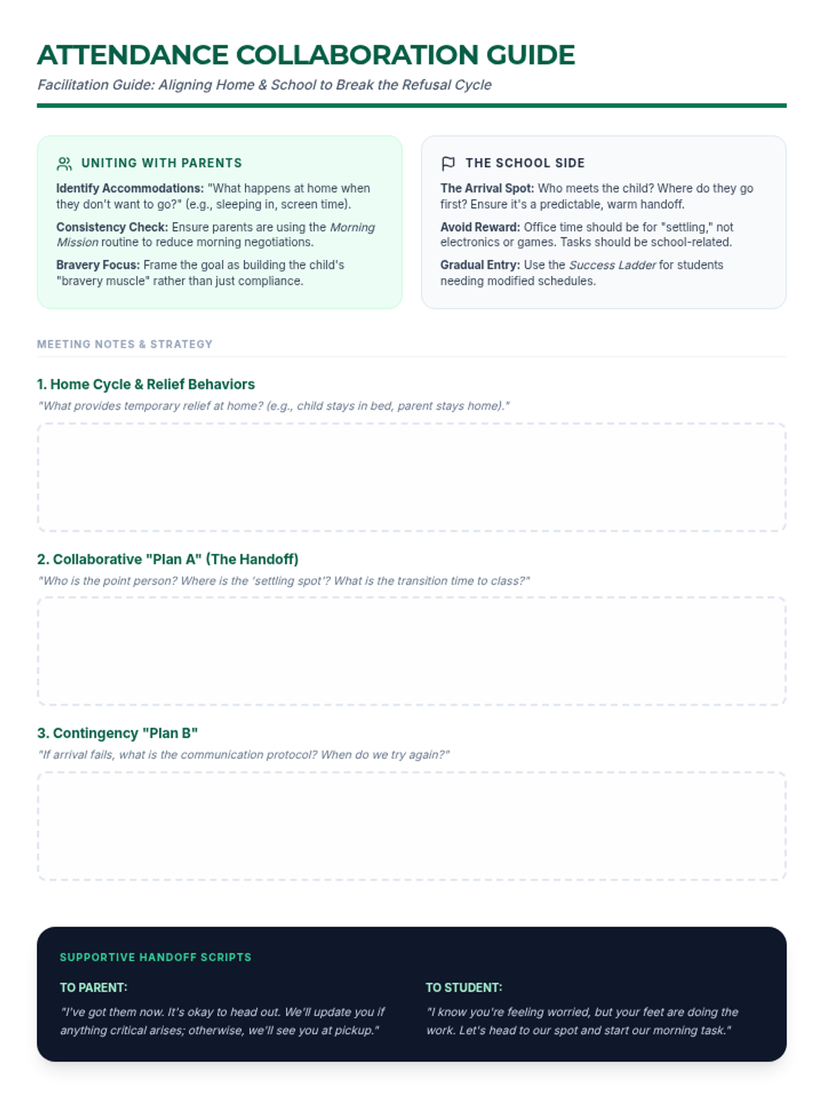 A facilitation guide for teachers and administrators to lead collaborative meetings with parents of students experiencing school refusal. Focuses on shared language, warm handoffs, and avoiding school-based accommodations.