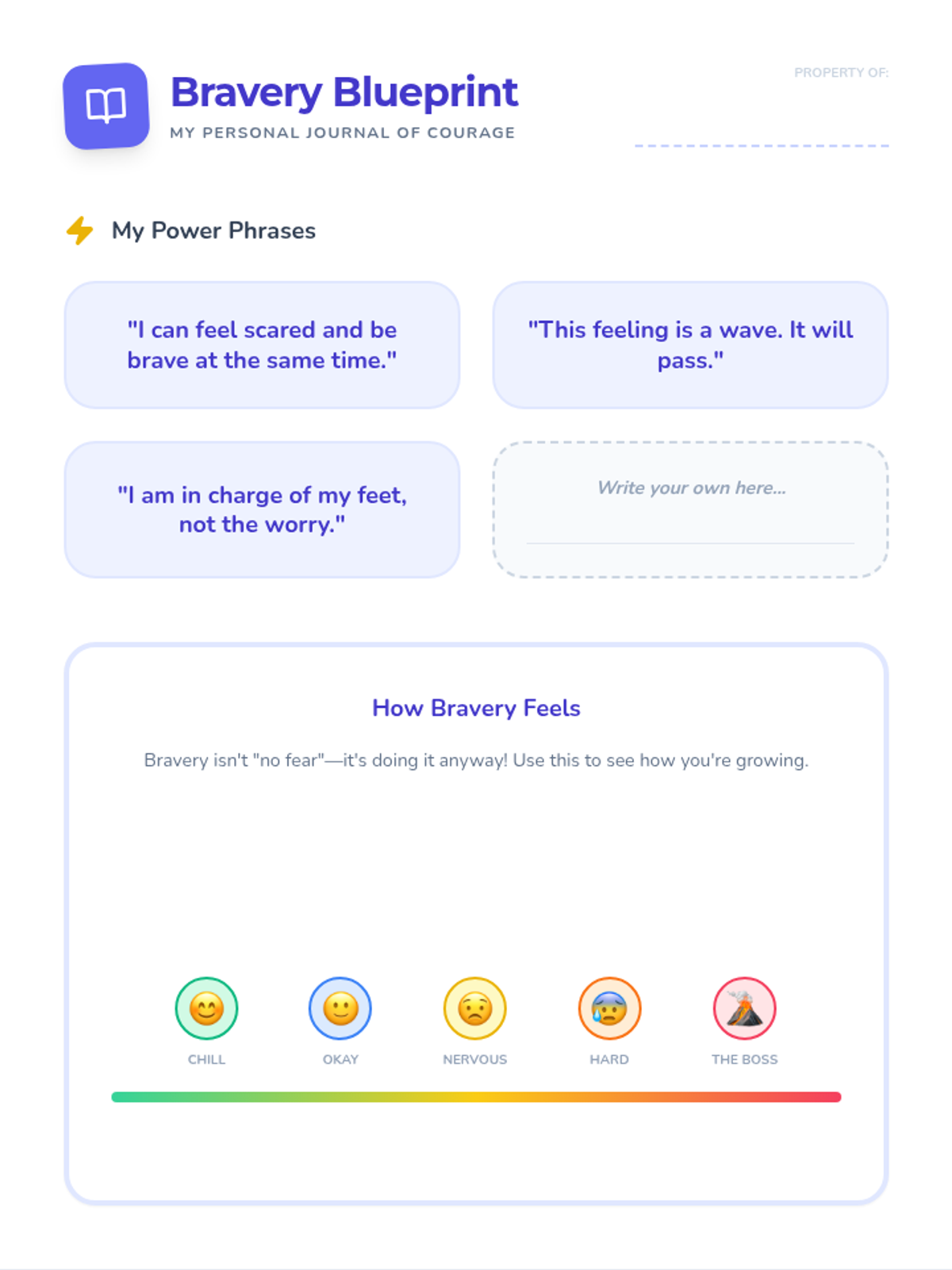 A child-friendly personal journal for students to track their bravery wins, reframe anxious thoughts, and celebrate progress. Features a "Worry vs. Reality" reflection tool and a daily bravery star tracker.