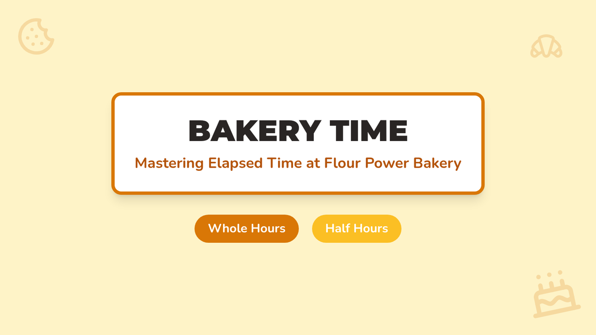 A guided presentation for teaching second graders elapsed time in whole and half-hour increments, featuring a cohesive bakery theme with visual examples.