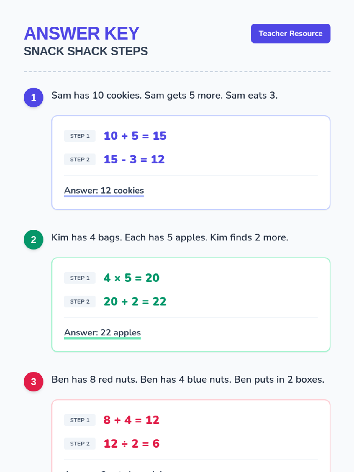 An answer key for the Snack Shack Steps worksheet, providing step-by-step solutions for the three two-step word problems.