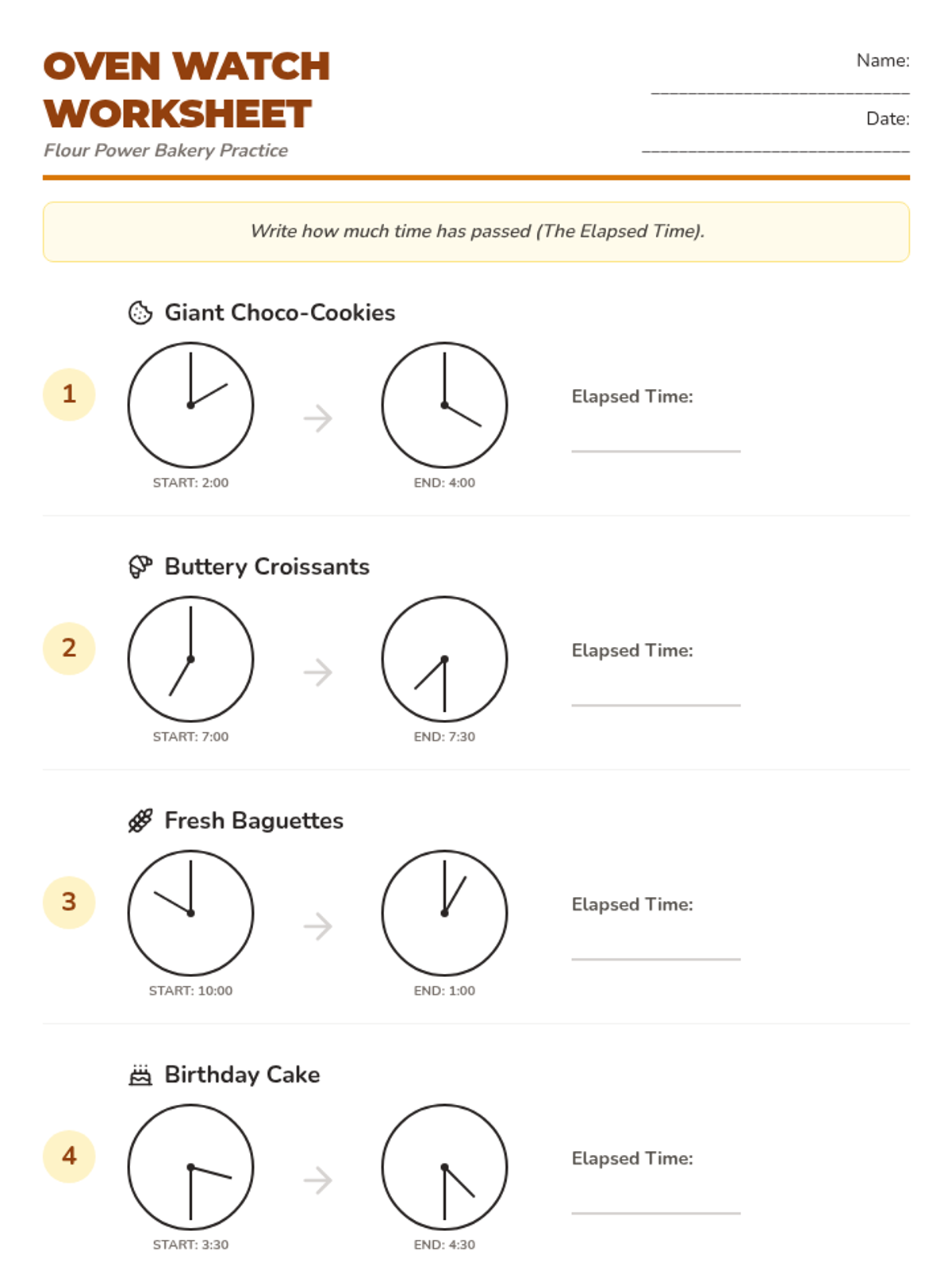 A print-ready worksheet featuring analog clocks where students determine the elapsed time for various bakery items in whole and half-hour increments. fixed layout for single-page printing.