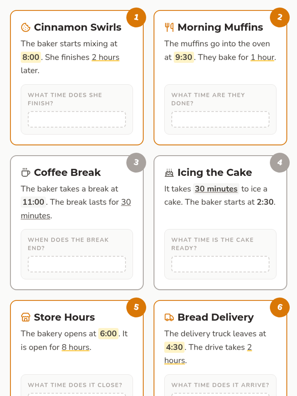 Large, printable task cards featuring bakery-themed elapsed time word problems with improved layout and visibility. removed fixed heights to prevent answer box clipping.